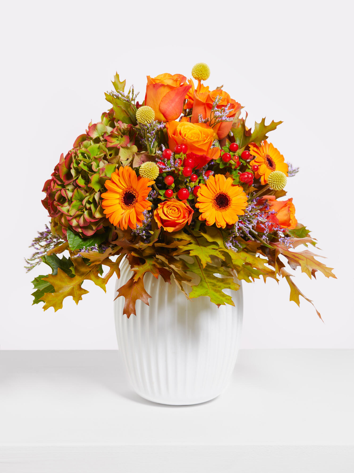 Kompakt gebundener Strauß in Orange-Rot-Gelb mit Rosen, Hortensien, Germini, Hypericum, Limonium und Craspedia. Als Beiwerk wird Eiche verarbeitet.