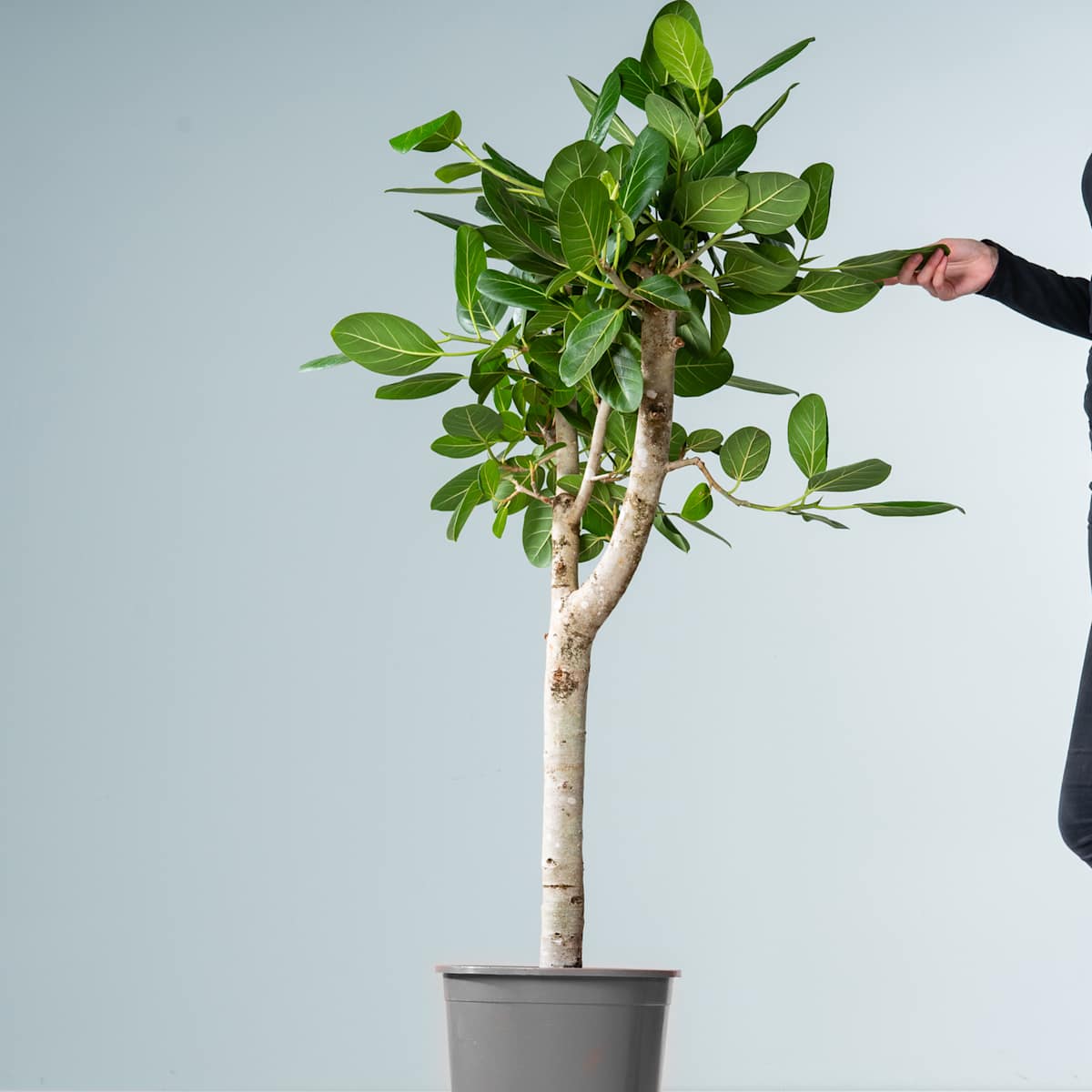 Die Indische Feige ‚Benghalensis‘ kommt, wie ihr Name ja schon verrät, ursprünglich aus Indien. Dort wächst sie zu echt imposanten Bäumen heran. Und auch bei dir kann sich die Banyanfeige, wie Ficus benghalensis auch genannt wird, zu einem stattlichen Exemplar von bis zu 2 m Größe und 60 cm Breite heranwachsen. Mit seinen großen, dunkelgrünen Blättern die perfekte Bereicherung für deinen Urban-Jungle! Die Banyanfeige muss regelmäßig gegossen werden. Wenn du darauf achtest, dass die Erde immer leicht feucht ist, belohnt sie dich mit kräftigem Wuchs. Am besten kann sie das an einem hellen Standort. Die pralle Sonne mag sie nicht so gerne.