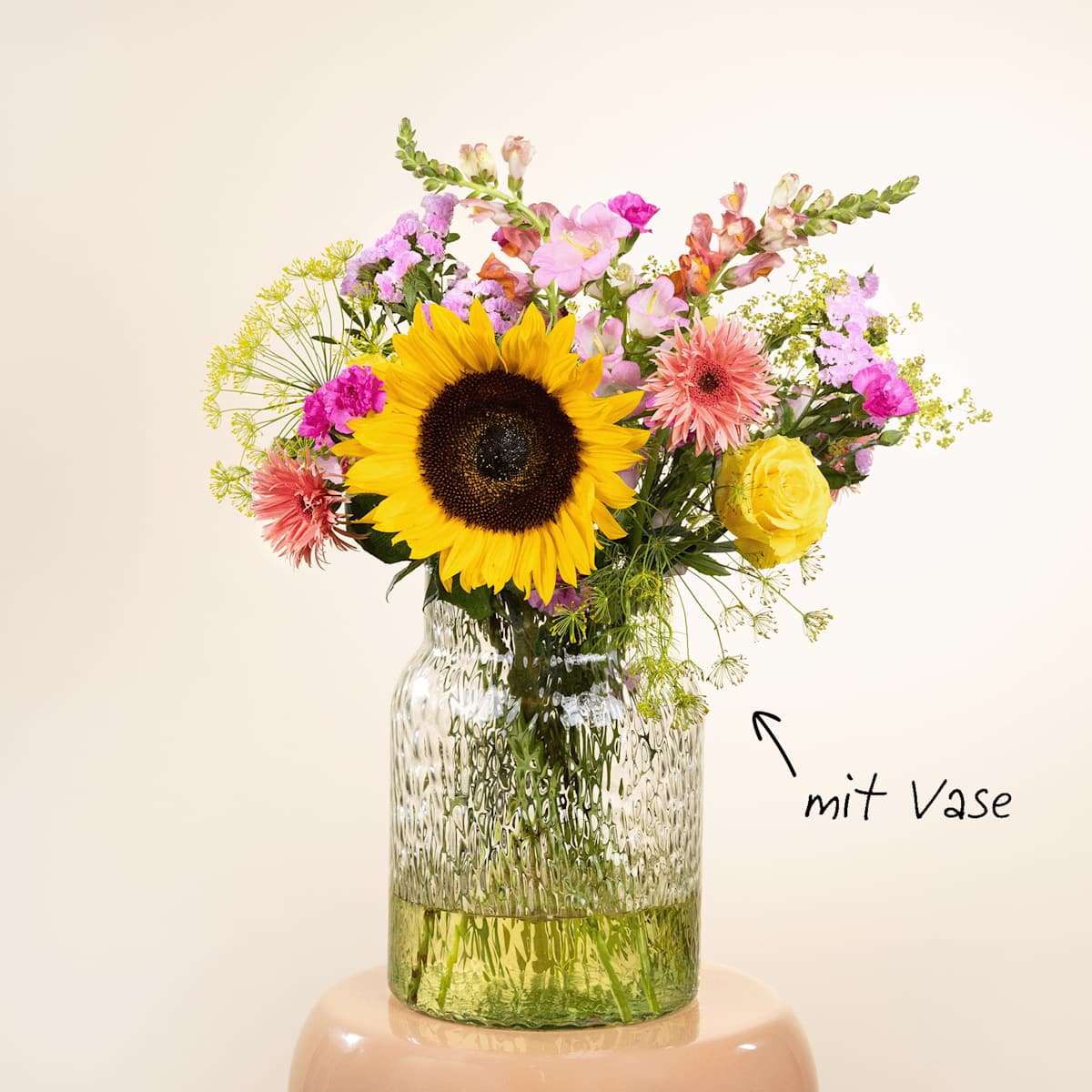 Der prächtige Wiesenstrauß Isabell lacht mit der Sonne um die Wette. Bei diesem Anblick kommt die gute Laune von ganz allein. Zusammengesetzt ist die herrlich ungezwungene Pracht aus filigranem Dill, schönen Gerbera, zauberhaften Glockenblumen, feinem Strandflieder und verträumten Nelken sowie eleganten Rosen, betörendem Frauenmantel und herausragenden Löwenmäulchen. Das Highlight bilden jedoch die leuchtend gelben Sonnenblumen, die in das Arrangement eingearbeitet sind. Hier dominieren die Farben Gelb und Rosé. Die Stiellänge der einzelnen Blumen und Gräser beträgt ca. 50 cm. Die passende Vase, designed by BLUME2000, ist ebenfalls im Lieferumfang enthalten. Das hübsche Exemplar ist mundgeblasen und aus 100 % Recycling-Glas gefertigt. Somit leistest du noch einen Beitrag zum Umweltschutz. Produziert wurde sie in Europa. Die Vase ist etwa 26,5 cm hoch und hat an der breitesten Stelle einen Durchmesser von ca. 19 cm. Das hübsche Ensemble wirkt wie frisch von der Wiese gepflückt und verströmt einen besonderen Charme. Ein perfekter Gute-Laune-Gruß für deine Lieben.