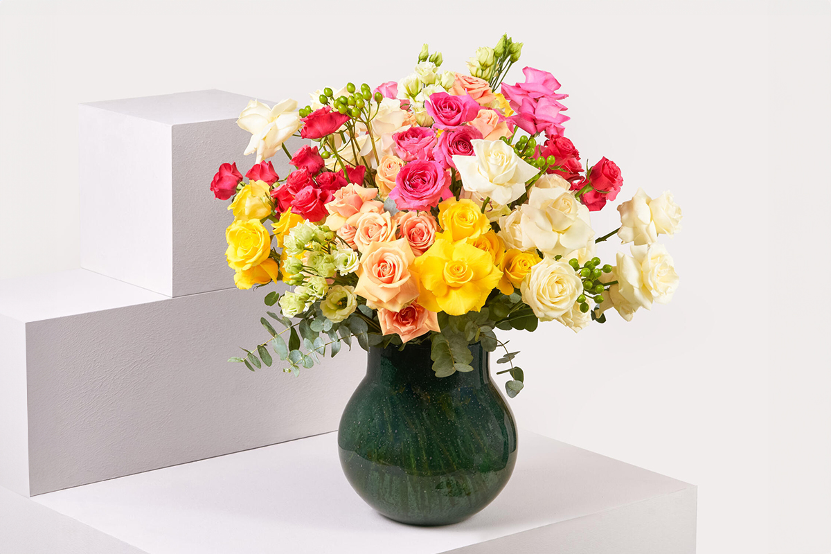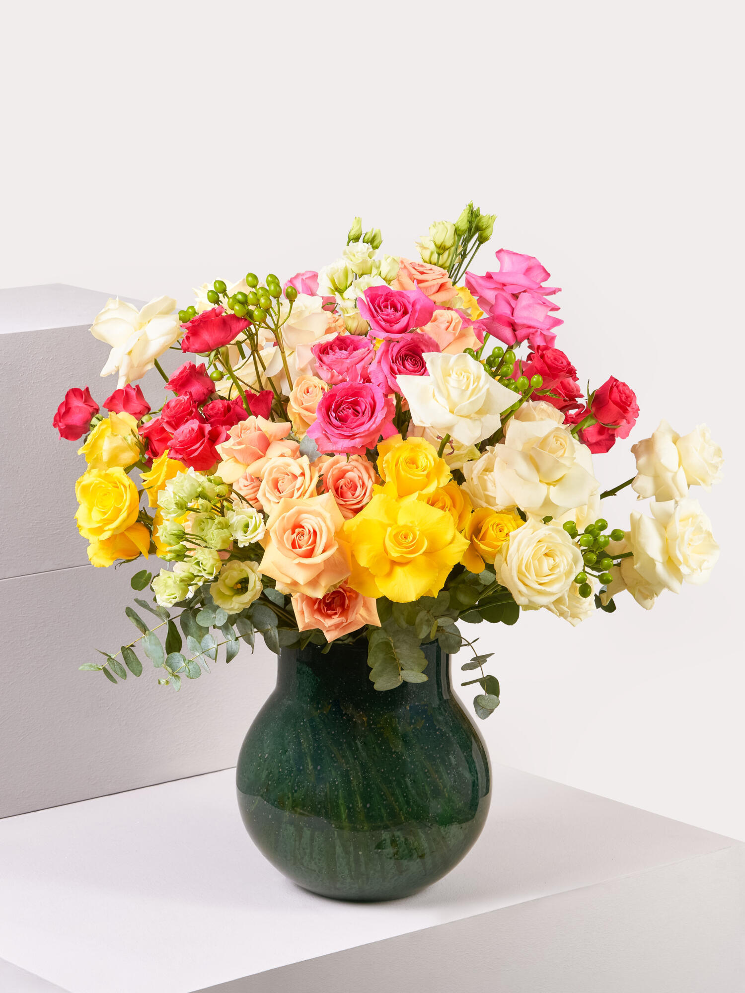 Entdecken Sie den Inbegriff floristischer Kunstfertigkeit mit dem luxuriösen Rosenstrauß „Joie de Vivre“, der sorgfältig ausgewählte, großblütige Rosen in einem Kaleidoskop aus Gelb-, Pink- und Apricot-Tönen präsentiert. Jede einzelne Blume wird dabei meisterhaft in unterschiedlichen Stadien der Entfaltung arrangiert und spiegelt damit die Einzigartigkeit und Schönheit des Moments wider. Dieser rund gebundene Strauß zeichnet sich durch seinen locker definierten Umriss aus, der eine natürliche und ungezwungene Atmosphäre vermittelt. Dezent eingebettet zwischen den opulenten Rosen finden sich Akzente von weißem Lysianthus, der für seine zarte Anmut bekannt ist, Hypericum und Eucalyptus, dessen blaugrüne Blätter einen frischen Duft verströmen und das Arrangement visuell aufwerten. Mit seinem beeindruckenden Durchmesser von ca. 65 cm ist dieser Strauß nicht nur ein erlesenes Meisterwerk, sondern auch ein Symbol für Luxus und Eleganz. Die kunstvolle Anordnung in Höhen und Tiefen sowie die farbliche Zusammenstellung verleihen dem Rosenstrauß eine dynamische Struktur, die das Auge erfreut und den Geist belebt. Ideal als exquisites Geschenk oder als herausragendes Element eines modernen Interieurs, steht dieser außergewöhnliche Rosenstrauß für die Quintessenz von Schönheit und Exklusivität. Erleben Sie den Zauber und die elegante Leichtigkeit, die dieser wunderschöne Strauß in jeden Raum transportiert.