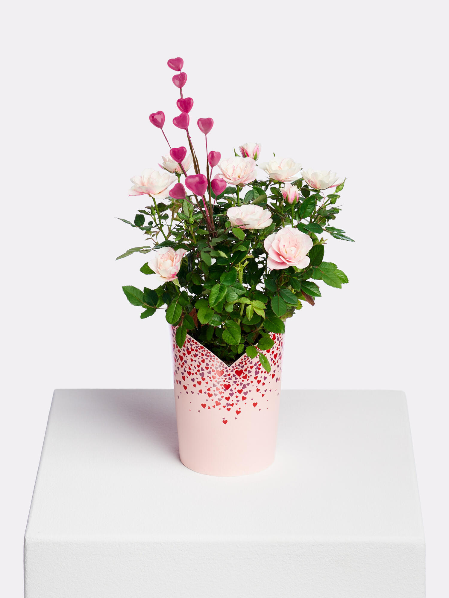 Die rosafarbene Rose mit Herzstecker und Coverpot online verschicken. ➤ Jetzt online bestellen und die Liebe verschenken!