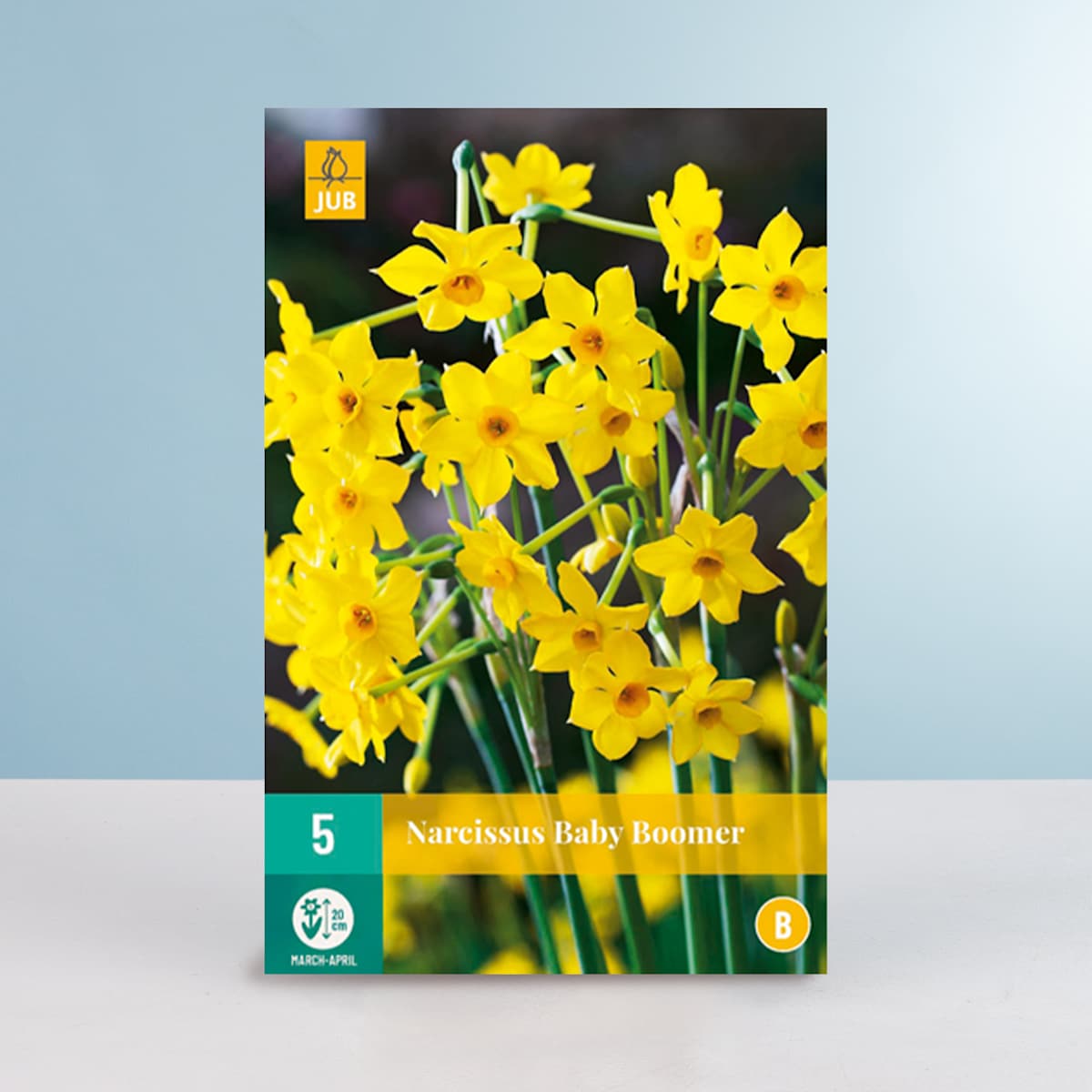 Sind sie nicht süß?! Die Blüten der Jonquilla-Narzisse ‚Baby Boomer‘ sind etwas kleiner, als du es vielleicht von anderen Vertreterinnen der Art Narcissus Hybrid kennst. Dafür gibt es bei ihr gleich mehrere dieser niedlichen, gelben Blüten pro Blütenstiel. Und damit das auch jeder sieht, wird diese Jonquilla-Narzisse etwa 45 cm hoch und 10 cm breit. Solange du eine durchlässige Erde und einen windgeschützten, sonnigen Standort wählst, kannst du dir aussuchen, ob du die 5 Zwiebeln, die du erhältst, in deinen Garten, deine Blumenkübel oder deine Balkonkästen setzt.
