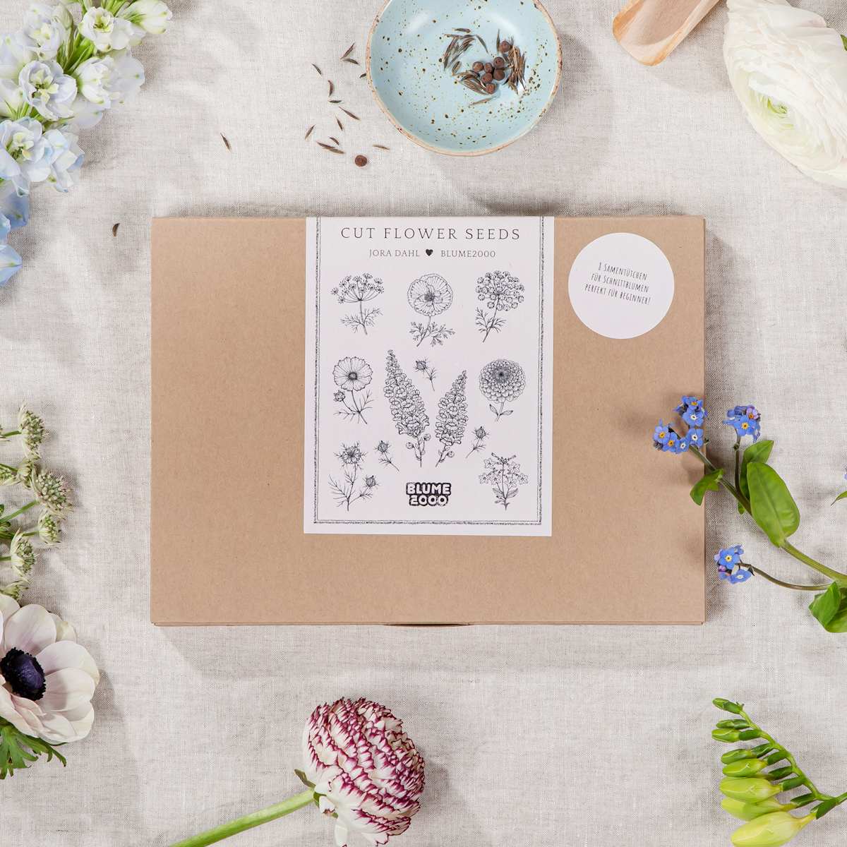 Du liebst den Anblick natürlicher Blumen und möchtest dich an ihrem Wuchs erfreuen? Dann wird dich unsere Jora Dahl x BLUME2000 Samengutkollektion Cut Flower Seeds garantiert begeistern. Hier kannst du die Entwicklung der Pflanzen vom ersten Setzen bis zum vollständigen Erblühen beobachten und deinen Erfolg genießen. Die Samengutkollektion enthält Mohn „Mother of Pearl“, Duftwicken „Light Blue“, Zinnien „Bernarys Giant Salmon“ und hübsche Kosmeen „Apricot Lemonade“. Feiner Ziertabak „Grandiflora“, blühfreudige Ammi Majus, Jungfer im Grünen „Miss Jekyll“ und Strohblumen „White“ sind ebenfalls Teil der Kollektion. Ob frei im Beet oder in einem Blumenkasten, die kunterbunte Pracht kommt überall perfekt zur Geltung und lockt so manchen Schmetterling an. Wir haben in Zusammenarbeit mit Jora Dahl eine handverlesene und limitierte Kollektion an Schnittblumensamen entworfen. Sie enthält acht Sorten für Schnittblumen, die perfekt für Beginner geeignet sind.