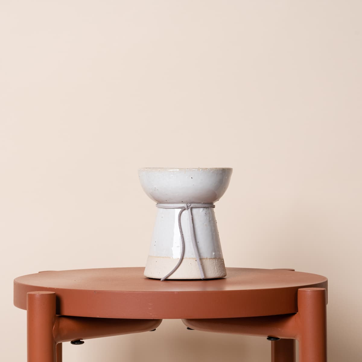 Dieser Hyazinthentopf möchte sich in deiner Küche nützlich machen und freut sich auf deine Bestellung. Bestmöglich ausgebildet steht er dir auf seinem 7,5 cm hohen Sockel bei allem zur Seite, was seine 11 cm hohe und 9 cm breite Gestalt leisten kann. Dieses erfahrene Keramikgefäß kümmert sich stets professionell um deine Zufriedenheit. Ein paar braun-schwarze Sprenkel lassen sich dabei dennoch nicht vermeiden. Mal glasiert, mal unglasiert, auf alle Fälle aber gesandet mit grauem Lederband wartet dein neuer Hyazinthentopf in Creme-Weiß auf seinen nächsten Auftrag und sieht dir derweil aufmerksam über die Schulter.