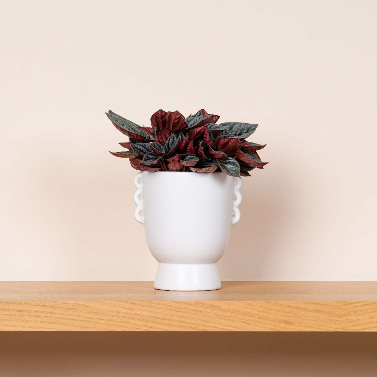 Wenn zwei Henkel nicht ausreichen, nimm diesen weißen Keramik-Übertopf, denn er hat gleich sechs davon. Jeweils drei kleine Henkel sitzen übereinander an den gegenüberliegenden Seiten des schönen Keramik-Übertopfs. Sie nehmen vor allem eine dekorative Funktion ein – die bauchige Form des Übertopfs lässt sich so gut mit den Händen fassen. Seine Form erweitert sich nach oben hin und besitzt an der höchsten Stelle einen Durchmesser von 12,2 cm. Der weiße Keramik-Übertopf ist 16 cm hoch – davon entfallen 3,5 cm auf den stabilen Sockel, welcher den Übertopf von Weitem wie eine skurrile Tasse wirken lässt. Hol dir diesen so einfach und doch ungewöhnlich gestalteten Topf für deine Pflanzen!