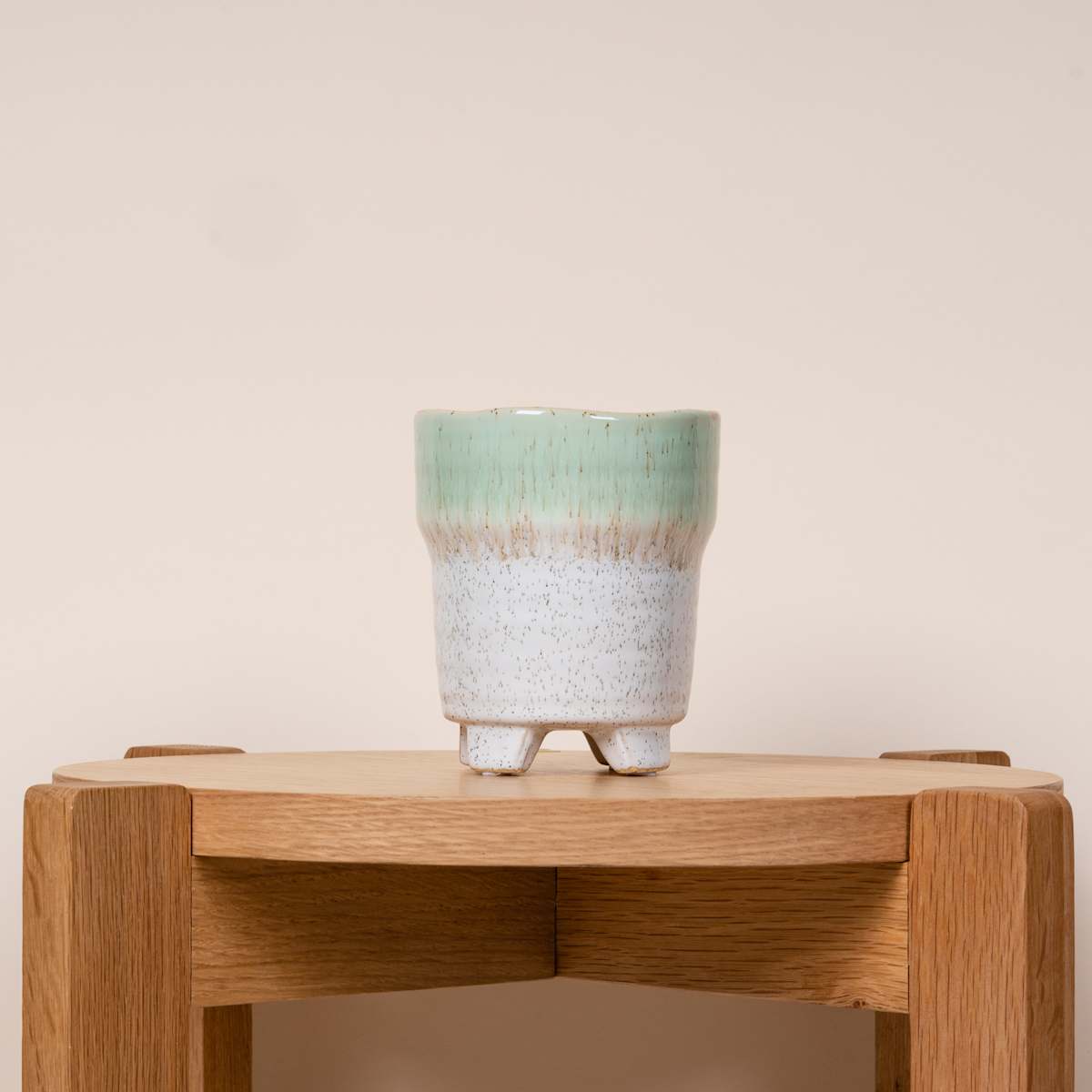 Dieser grün-weiße Blumentopf aus unserem Online-Bestell-Shop zeigt sich ganz und gar, wie er eben ist. Er möchte auf keinen Fall mit dem weltweiten Vertuschungsprogramm der übrigen Orchideentöpfe in Verbindung gebracht werden, auch wenn seine reaktive Glasur auf den ersten Blick etwas anderes vermuten lässt. Deine Topfpflanzen werden sich sicher schnell mit der 10 cm hohen und 10 cm breiten Echtheit des Blumentopfes abfinden und erleben vielleicht selbst noch einen Authentizitätssprung. Doch keine Angst! Das Wachstumsgehüpfe steht dank der 4 weißen Moosgummifüßchen auf sicherem Boden.