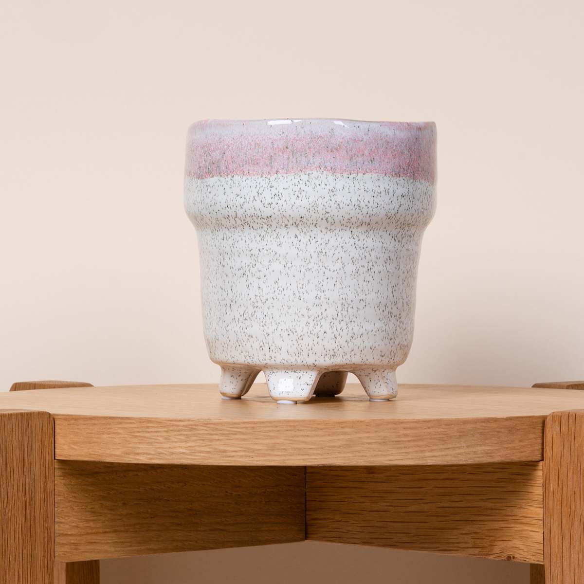 Dieser rosa/weiße Blumentopf aus unserem Online-Bestell-Shop zeigt sich ganz und gar, wie er eben ist. Er möchte auf keinen Fall mit dem weltweiten Vertuschungsprogramm der übrigen Orchideentöpfe in Verbindung gebracht werden, auch wenn seine reaktive Glasur auf den ersten Blick etwas anderes vermuten lässt. Deine Topfpflanzen werden sich sicher schnell mit der 11,5 cm hohen und 12 cm breiten Echtheit des Blumentopfes abfinden und erleben vielleicht selbst noch einen Authentizitätssprung. Doch keine Angst! Das Wachstumsgehüpfe steht dank der 4 weißen Moosgummifüßchen auf sicherem Boden.