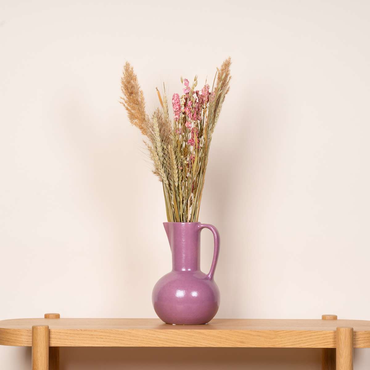 Flieder ist eine erfrischende Farbe – das prachtvolle, helle Violett holt den Frühling nach Hause. In diesem Fall kommt die optische Erfrischung in Form eines 25 cm hohen Kruges mit einer 16,5 cm durchmessenden Kugel an seiner Basis. Die bauchige Form erlaubt es auch wunderbar, diesen Krug als Vase für hübsche Blumensträuße zu benutzen. Dank ihres praktischen, geschwungenen Henkels und dem Ausgießer an der Vorderseite ist diese Keramik-Vase ebenso zum Gießen deiner Pflanzen geeignet. Sie ist aus Steingut gefertigt, von außen wie innen matt glasiert und leuchtet im Farbton „Flieder 688U“. Die fliederfarbene Kombination aus Keramik-Vase und Keramik-Krug wiegt gut ein Kilo.