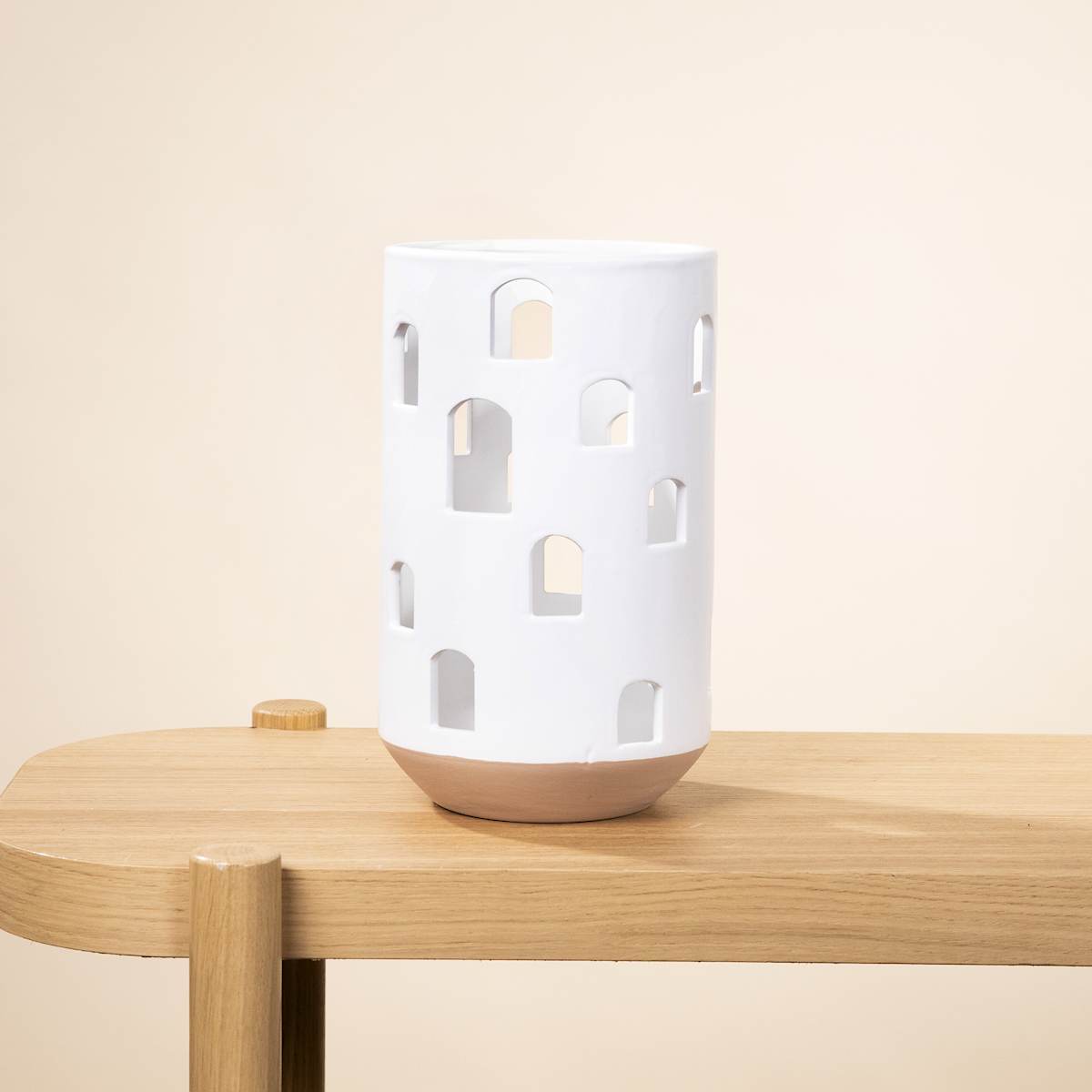 Du liebst das Lichtspiel einer flackernden Kerze? Dann wird dir unser „Keramik Windlicht in Weiß“ garantiert gefallen. Du bestückst es einfach mit einer Kerze und kannst dich an den zauberhaften Lichtakzenten erfreuen. Das Windlicht hat eine Höhe von 25 cm. Der Durchmesser beträgt 14,8 cm und am Sockel sind es 10 cm. Die hochwertige Keramik ist glänzend weiß glasiert, nur der Sockel ist unglasiert. Er besitzt eine sandige, raue Oberfläche. Durch die fensterähnliche Öffnung in unterschiedlicher Höhe zaubert das Kerzenlicht tolle Lichtakzente. Bei diesem Anblick lässt man sich gerne ins Land der Träume entführen. Was meinst du, wäre das Keramik-Windlicht nicht eine tolle Deko für dich?
