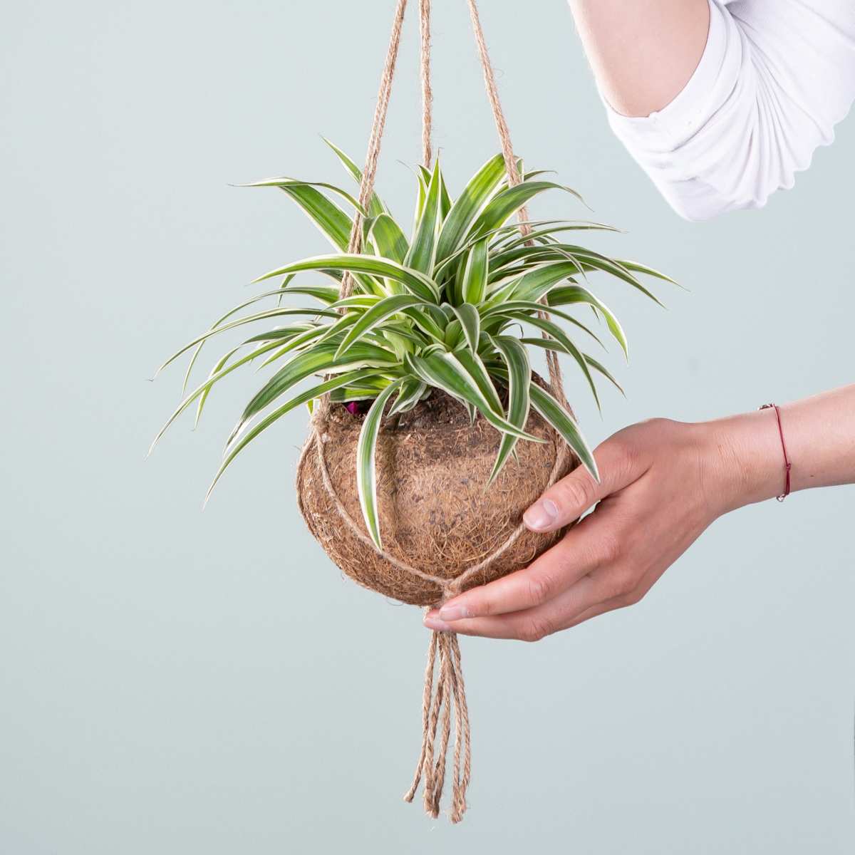 Kokodama ‚Chlorophytum‘ – keine Angst, das ist alles ganz natürlich! Sogar plastikfrei. Es ist einfach eine Grünlilie in einem Topf, der nur aus Kokosfasern besteht. Das nennt sich dann Kokodama und Chlorophytum ist die botanische Bezeichnung für die Grünlilie. Genau, das ist diese pflegeleichte Grünpflanze, die mit ihren Blättern die Luft reinigen kann und etwa 25 cm hoch und 20 cm breit wird. Mit Schnüren dekorativ zur Pflanz-Ampel gebunden kannst du deine Kokodama ‚Chlorophytum‘ fast überall aufhängen. Praktisch, oder? Die Kokodama ‚Chlorophytum‘ muss regelmäßig gegossen werden. Wenn du darauf achtest, dass die Erde immer leicht feucht ist, belohnt sie dich mit kräftigem Wuchs. Am besten kann sie das an einem hellen Standort. Die pralle Sonne mag sie nicht so gerne. Bitte beachte, dass der Kokosfasertopf ein Naturprodukt ist und daher nicht wasserdicht ist.