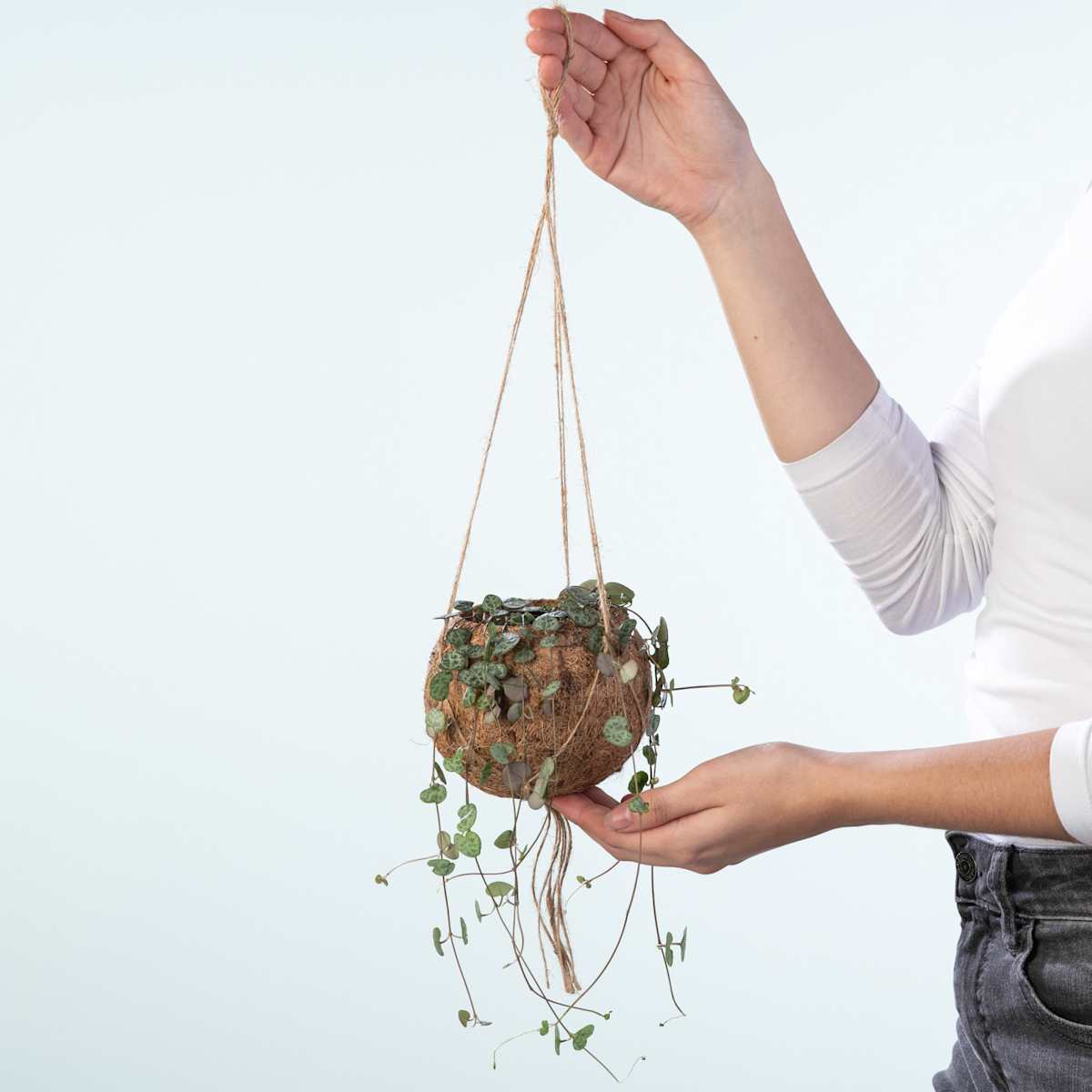 Hier brauchst du dich nicht entscheiden, welches dein Herzblatt sein soll – du kannst sie alle haben! An feinen Ranken trägt die Leuchterblume ‚String of Hearts‘ grau-grün gemusterte Herz-Blätter und sie möchte nichts lieber, als dein Heim damit verschönern. Mit ihrem hängenden Wuchs wird Ceropegia, wie sie sich botanisch nennt, etwa 20 cm breit und 30 cm lang. Übrigens bringt sie ihre Pflanzampel (es ist so ein schickes Teil aus Kokodama) gleich selber mit. Und wenn sie sich dann so richtig wohlfühlt bei dir, überrascht sie dich auch gerne mal mit rosafarbenen Blüten. Damit deine Liebste wächst und gedeiht, muss die Leuchterblume ‚String of Hearts‘ regelmäßig gegossen werden. Wenn du darauf achtest, dass die Erde immer leicht feucht ist, belohnt sie dich mit kräftigem Wuchs. Am besten kann sie das an einem sonnigen Standort, wenn es dort nicht zieht. Bitte beachte, dass der Kokosfasertopf ein Naturprodukt ist und daher nicht wasserdicht ist.