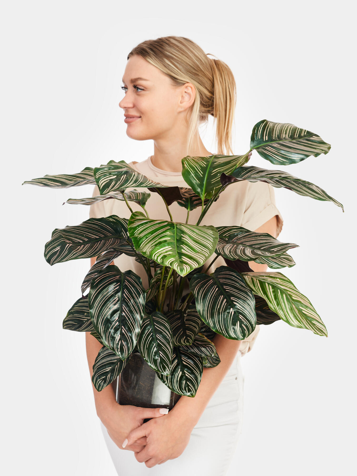 Entdecken Sie die atemberaubende Schönheit der Korbmarante (Calathea ornata sandriana), die in einer großzügigen Glasvase befüllt mit nährstoffreicher Spezialerde für Grünpflanzen, direkt zu Ihnen an die Wohnungstür geliefert wird. Diese prächtige Pflanze besticht durch ihre großen grünen Blätter, die mit einem auffälligen Netzwerk-Muster gezeichnet sind. Sie wird mit ihrer Größe von 70 cm sicherlich alle Blicke auf sich ziehen und Ihrem Raum eine elegante Atmosphäre verleihen. Die Pflege der Korbmarante ist denkbar einfach und unkompliziert. Sie fühlt sich am wohlsten bei Temperaturen zwischen 18 und 20 Grad Celsius und benötigt einen hellen bis halbschattigen Standort, jedoch ohne direkte Sonneneinstrahlung. Ein mittleres Gießverhalten ist ausreichend, aber sie liebt es, ab und zu mit Wasser besprüht zu werden, um die Luftfeuchtigkeit zu erhöhen. Mit der Korbmarante holen Sie sich nicht nur eine wunderschöne Zimmerpflanze ins Haus, sondern auch ein Stück Natur, die Ihre Raumluft spürbar verbessert und Ihre Sinne berührt. Bestellen Sie noch heute und lassen Sie sich von ihrer einzigartigen Ausstrahlung verzaubern!