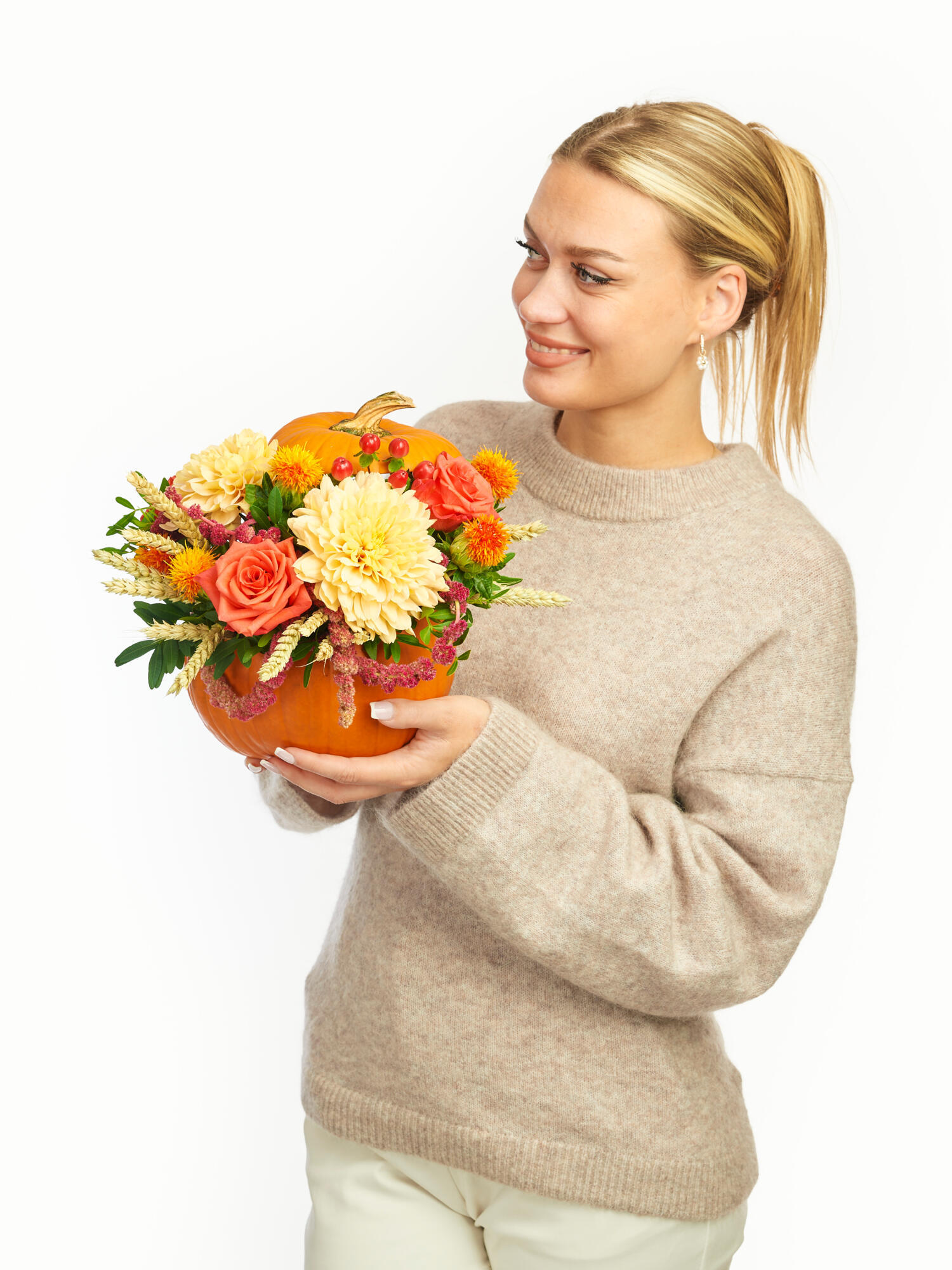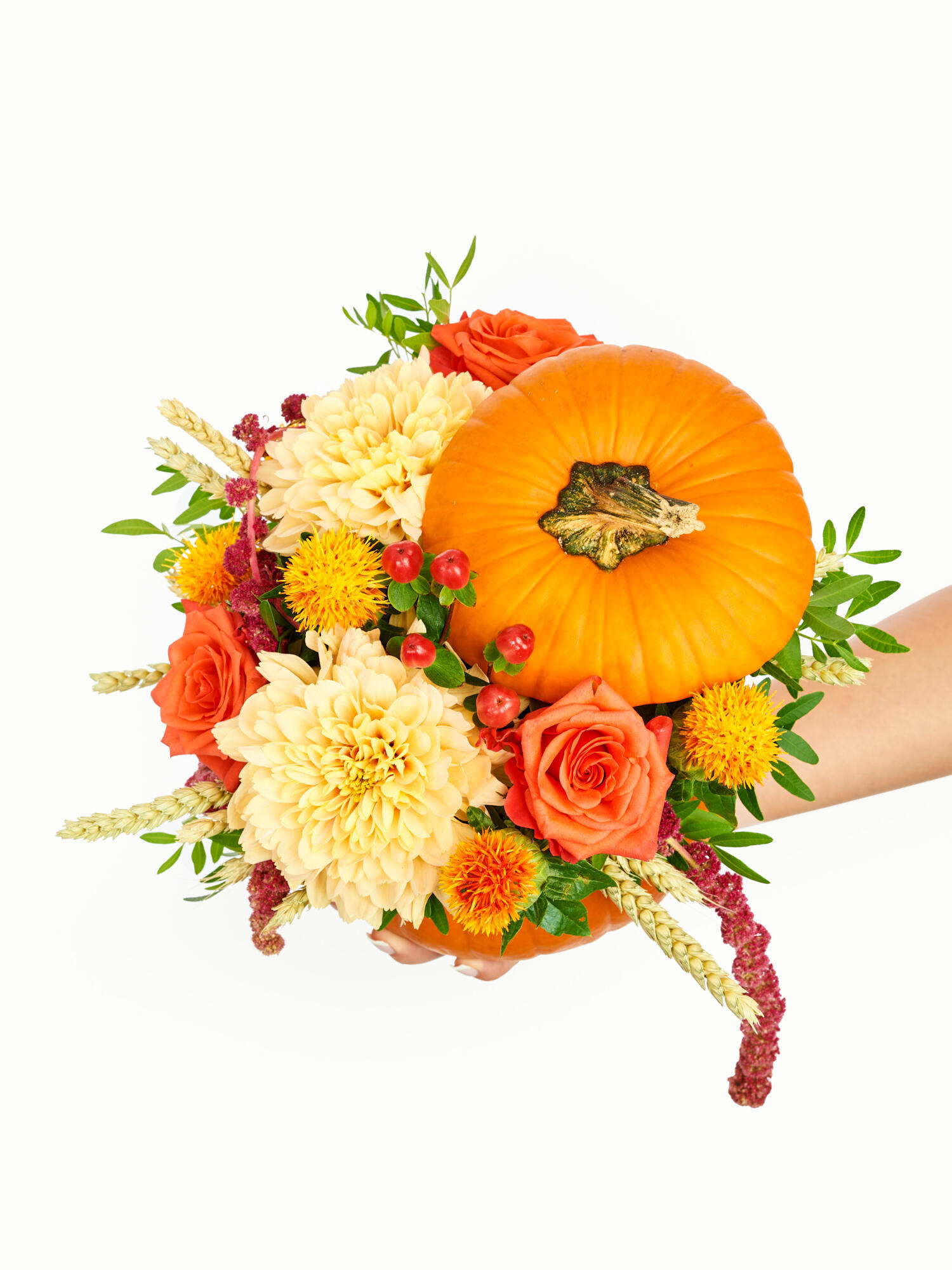 Herbstliches Kürbisgesteck in Orange-Apricot-Rot mit Deko-Chrysanthemen, Rosen, Carthamus, Amaranth und Hypericum. Als Dekoration werden Getreide und Pistazie verwendet.