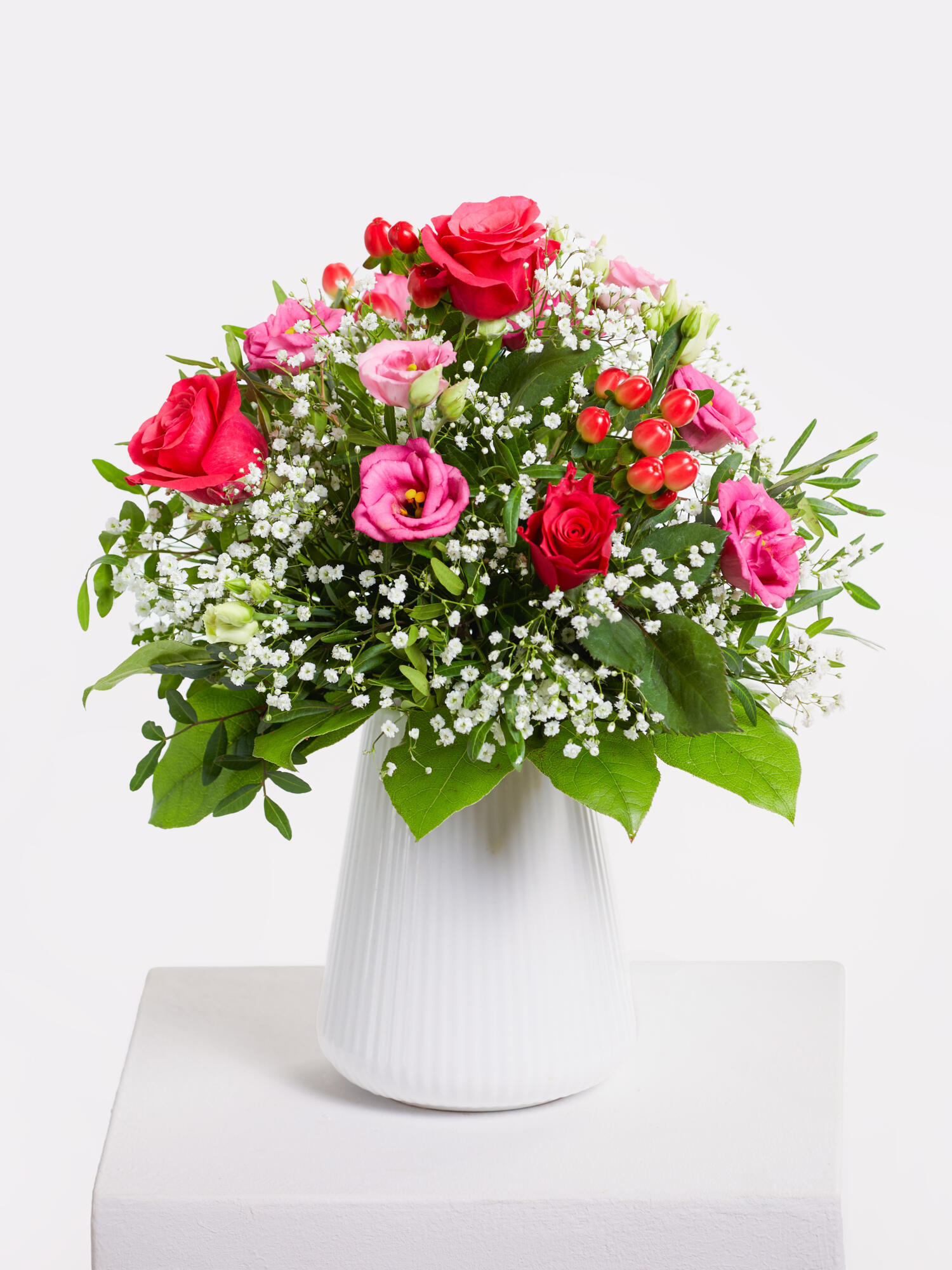 Rund gebundener Strauß in Pink-Rosa mit Rosen, Eustoma, Schleierkraut und rotem Hypericum. Als Beiwerk werden Salal und Pistazie verwendet.