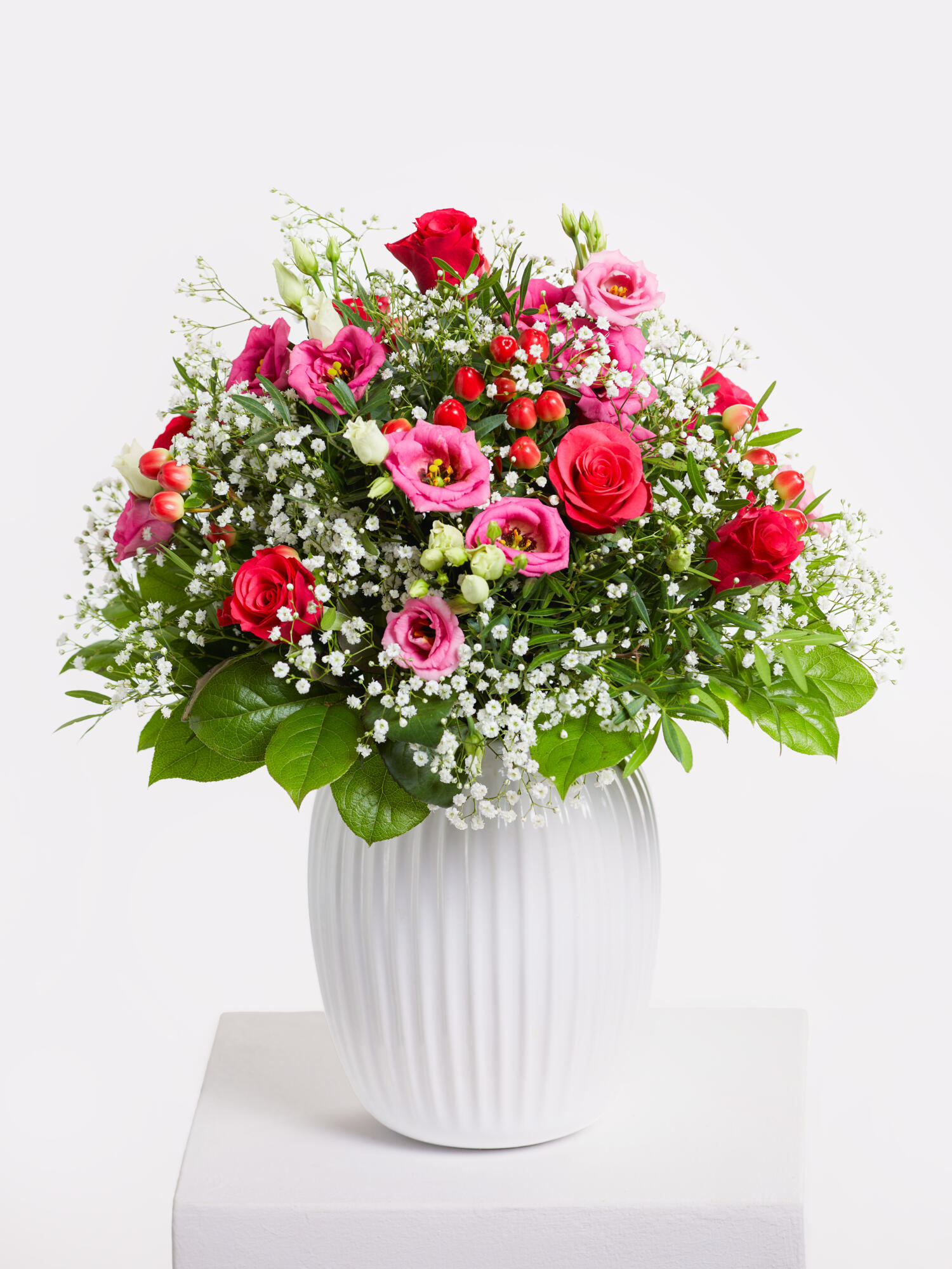 Rund gebundener Strauß in Pink-Rosa mit Rosen, Eustoma, Schleierkraut und rotem Hypericum. Als Beiwerk werden Salal und Pistazie verwendet.