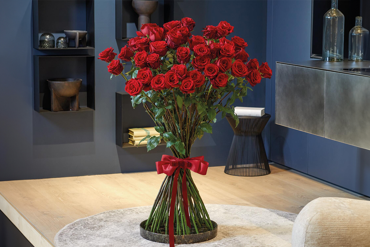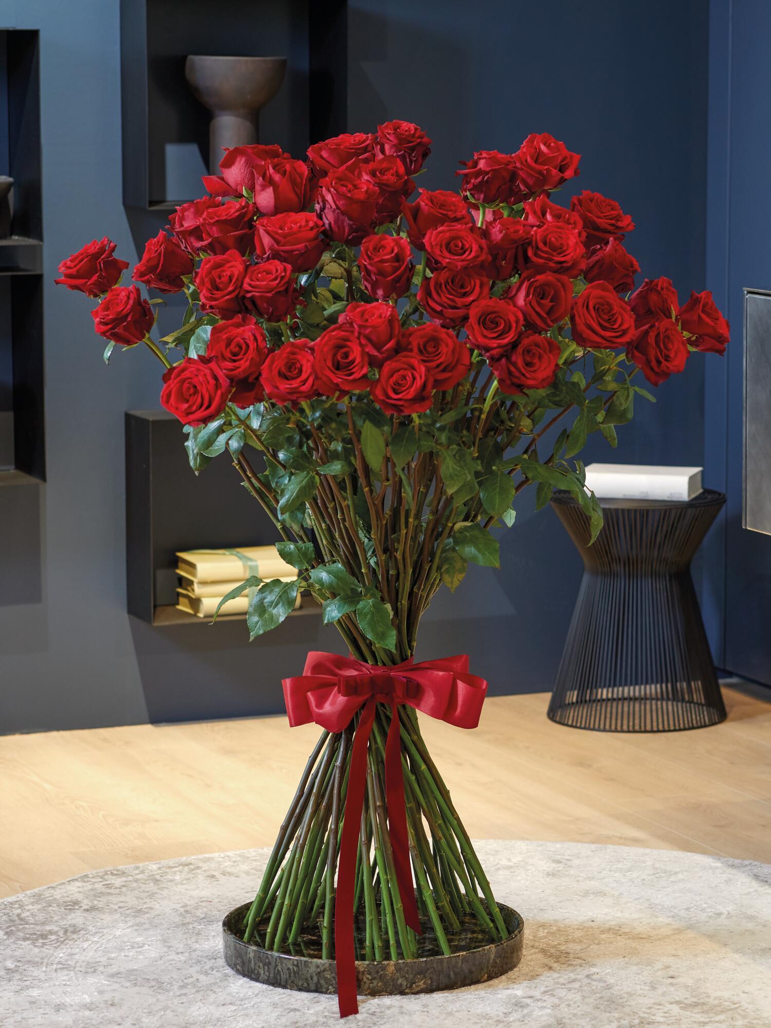 Dieser außergewöhnliche Rosenstrauß besteht aus wunderschönen, langstieligen tiefroten Rosen, die eine beeindruckende Länge von 1,20 m erreichen. Die großblütigen Rosen sind kunstvoll angeordnet, wobei sie auf einer Höhe leicht aufgelockert sind, um die natürliche Schönheit jeder einzelnen Blüte zu betonen. Die Bindestelle des edlen Rosenbouquets „L’Amour Éternel“ wird mit einer eleganten roten Schleife aus hochwertigem Taftband verziert, das dem Arrangement eine zusätzliche Raffinesse verleiht. Die Gesamtlänge des Blumenstraußes beträgt 120 cm, der Durchmesser großzügige 100 cm, was ihm eine imposante Präsenz verleiht. Dieser exquisite Rosenstrauß ist ein echter Eyecatcher und eignet sich perfekt als luxuriöses Geschenk für besondere Anlässe wie Hochzeits-Jubiläen, Geburtstage oder als romantische Gesten zum Valentinstag. Mit seiner beeindruckenden Größe und der meisterlichen Ausführung durch unsere erfahrenen Floristinnen und Floristen wird er sicherlich die Herzen der Beschenkten im Sturm erobern.