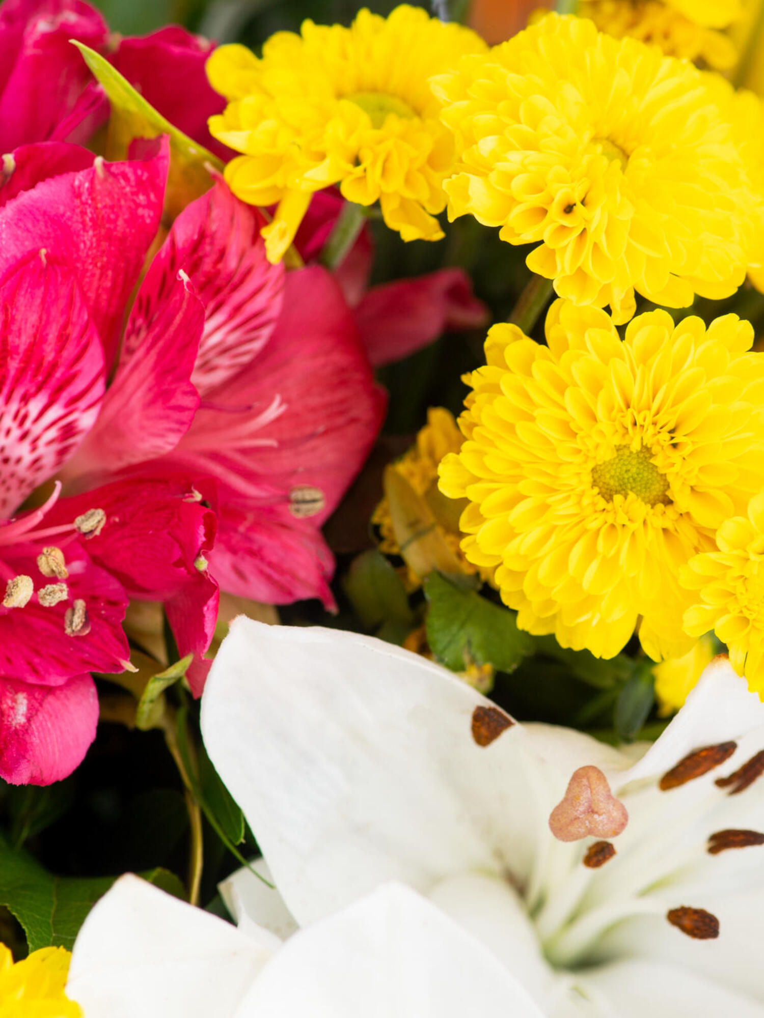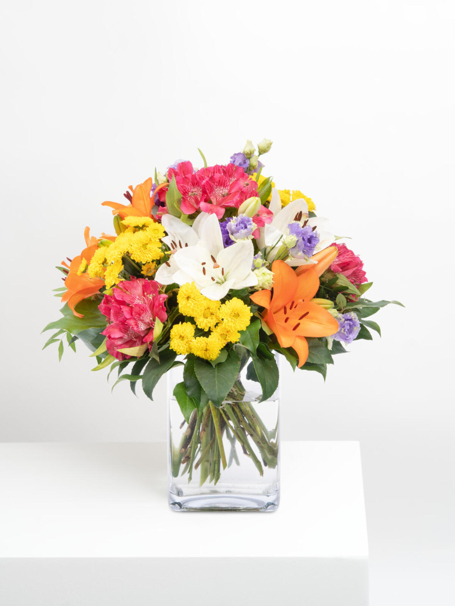 Rund gebundener Trauerstrauß in bunten Farben mit intensiv duftenden Lilien, Inkalilien (Alstromerien) und Santini. Als Beiwerk werden Salal, Pistazie und Aralie verwendet.