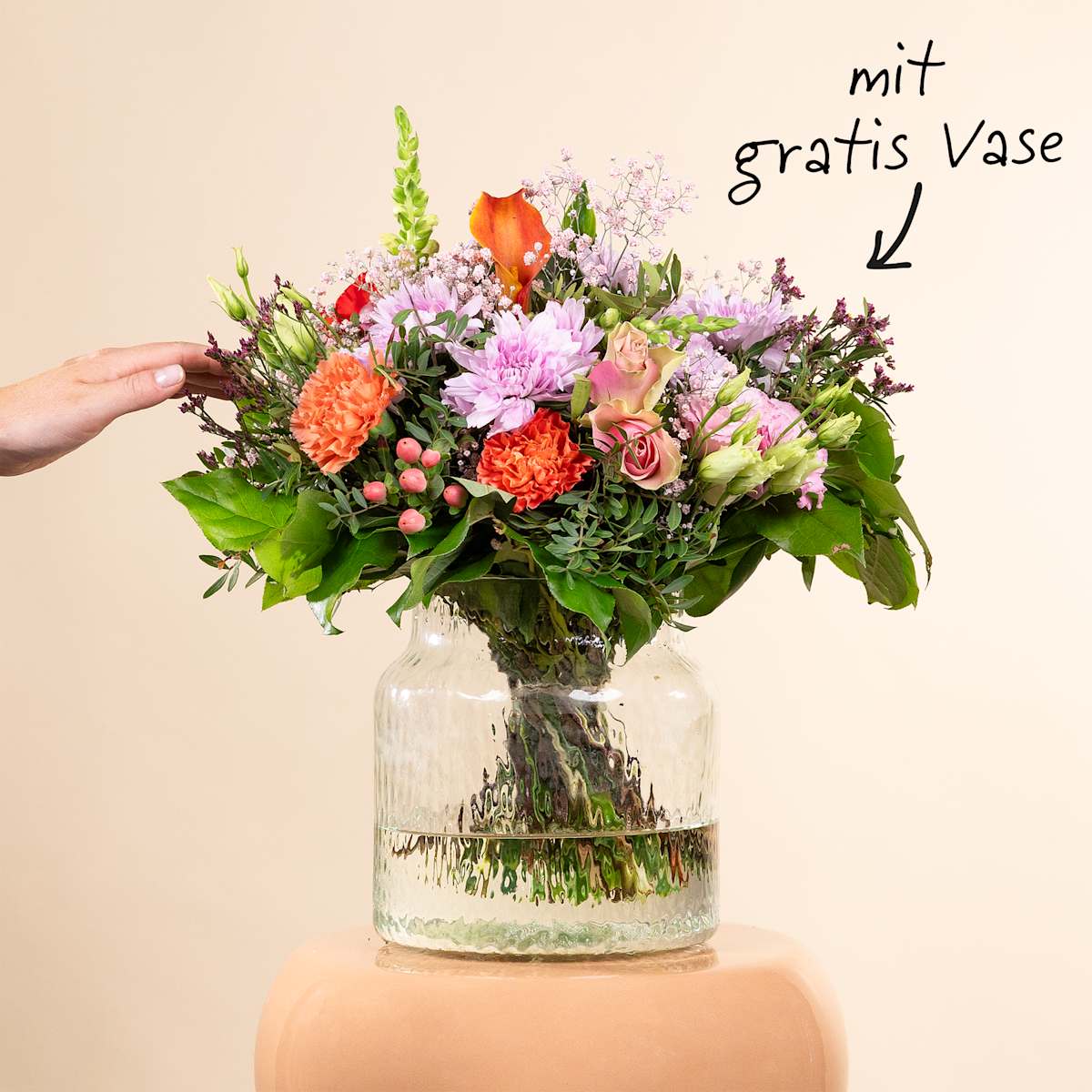 Leuchtend bunte Blumen sind der Inbegriff desSommers. Sie verströmen einen unvergleichlichen Duft und schenken gute Laune.Mit unserem liebevoll zusammengestellten Blumenstrauß Liebe Grüße M kannst dudir selbst oder auch anderen eine große Freude bereiten. Das prächtigeArrangement verfügt über einen stattlichen Durchmesser von etwa 35 cm. Nebeneleganten Rosen, verträumten Nelken, dekorativem Johanniskraut und feinenAlstromerien enthält es atemberaubende Callas mit beeindruckendenTrichterblüten, üppige Chrysanthemen, feine Lisianthus und Statice. Komplettiertwird das Arrangement von dekorativen Pistazienzweigen, Salal und filigranemSchleierkraut. Letzteres scheint zwischen den zauberhaften Blüten zu schwebenund verleiht dem Blumenstrauß eine romantische Note. Diepassende Vase, designed by BLUME2000, ist ebenfalls im Lieferumfang enthalten.Das hübsche Exemplar ist mundgeblasen und aus 100 Prozent Recycling-Glasgefertigt. Somit leistest du noch einen Beitrag zum Umweltschutz. Produziertwurde sie in Europa. Hier zeigt sich dieVielfalt der Natur von ihrer schönsten Seite.