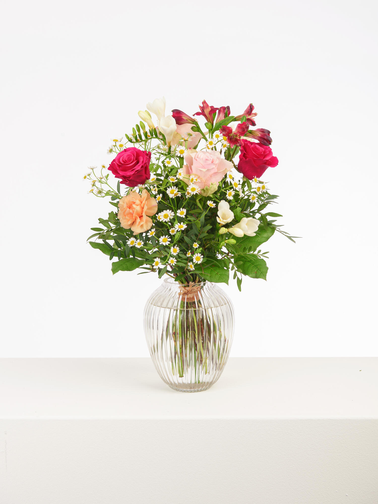 Rund gebundener Strauß in Bunt mit apricotfarbenen Nelken, pinken und rosa Rosen, roten Inkalilien (Alstromerien), Kamille und weißen, leicht duftenden Freesien. Als Beiwerk werden Pistazie und Salal verwendet.