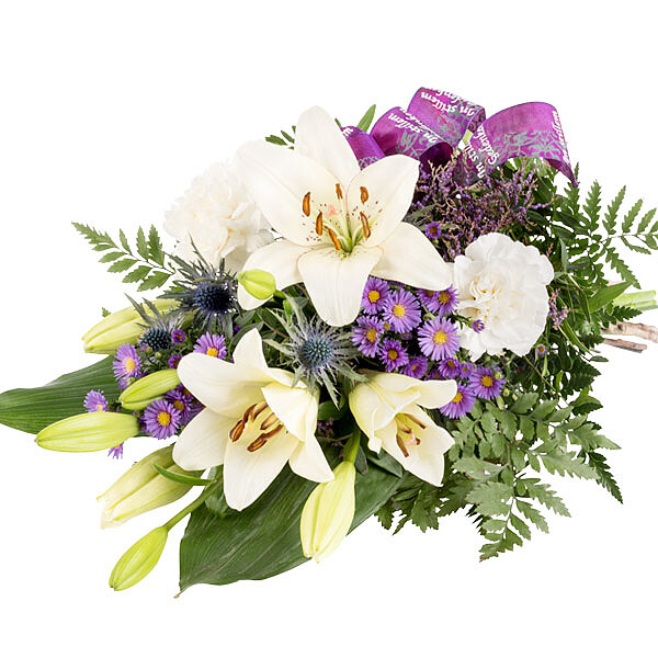 Dein Blumengruß besteht aus weißen und lila Blumen von Hand floristisch mit Schnittgrün zum Liegestrauß gebunden. Bitte beachte dass der Blumenstrauß von der Abbildung abweichen kann. Auch die Menge der Blüten weicht von der Abbildung ab. Das liegt daran dass jeder örtliche Florist individuell andere Einkaufsquellen durch seine Großhändler nutzt und somit die Mengen und Größen der Blüten abweichen können. Du kannst versichert sein dass immer dem Wert entsprechende Blumen in Blütengröße und Anzahl der Blumen verwendet wird.Lieferung im Laufe des Tages (ca. 09:00-19:00 Uhr). Einen unverbindlichen Wunschzeitraum kannst Du im Feld ?Adresszusatz? der Empfänger-Adresse eintragen. Hersteller:FloraPrima GmbHDidderser Str. 2838176 Wendeburginfo@floraprima.de