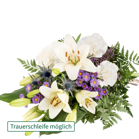 Würdevoller Blumengruß mit weißen Lilien blauem Limonium blauer Distel weißen Nelken blauem Septemberkraut Aspidistra Lederfarn und Pistochia. Die Größe beträgt ca. 40 x 60 cm. Frisch für Dich zusammengestellt mit Pflegetipps Blumennahrung und Wasser versorgt. Hinweis: Die Lilie des Straußes kommt im frischen und unaufgeblühten Zustand. Sie öffnen sich später als die anderen Blumen je nach Standort und Temperatur. Dieser Artikel kann mit dem Zustelldienst nicht direkt an einen Friedhof geliefert werden. Bitte wähle als Empfänger-Adresse das Trauerhaus oder Bestattungsunternehmen. Hersteller:FloraPrima GmbHDidderser Str. 2838176 Wendeburginfo@floraprima.de