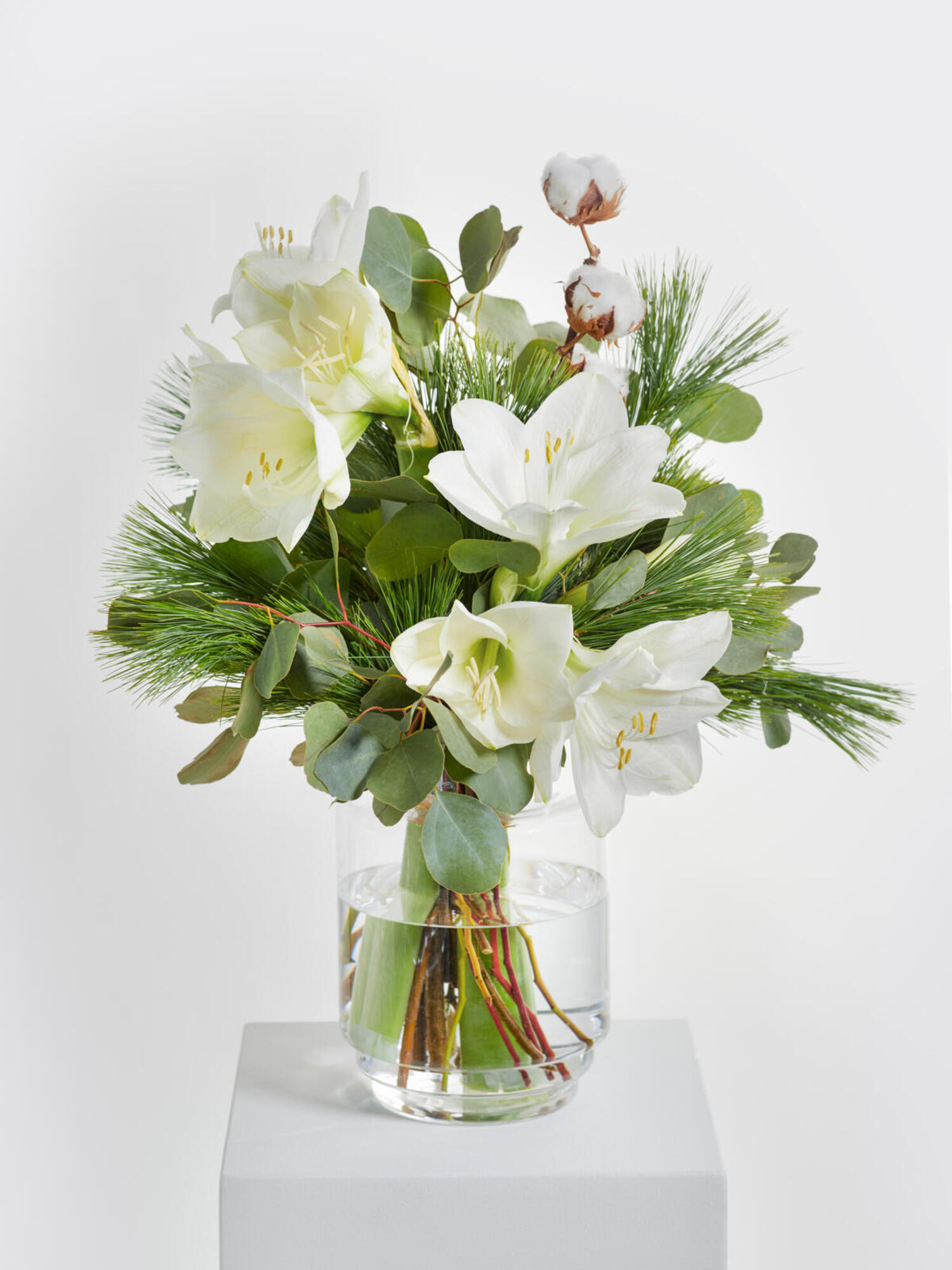 Luftig gebundener Strauß in Weiß mit Amaryllis und Baumwolle als Accessoires. Als Beiwerk werden Eukalyptus und Kiefer verwendet. Bei geschlossenen Amaryllis kann das vollständige Aufblühen bis zu 2-4 Tagen dauern.