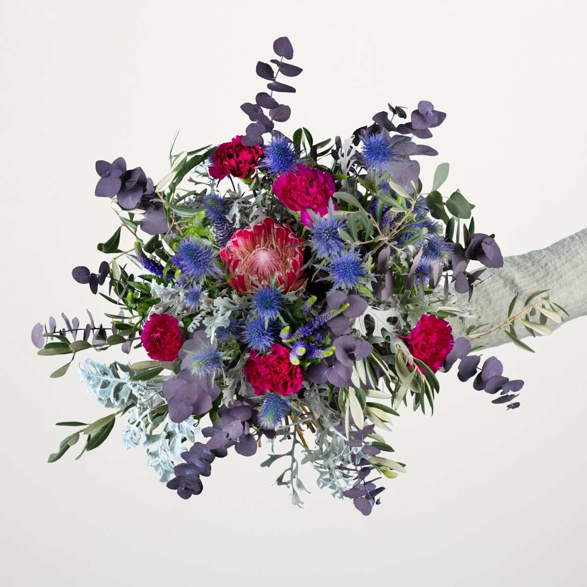 Weihnachten liegt in der Luft und langsam wird es Zeit, sich um die passenden Geschenke für deine Lieben zu kümmern. Doch was ist das perfekte Präsent zum schönsten Fest des Jahres? Wir sind überzeugt, mit einem exklusiven Blumenarrangement liegst du immer richtig. Unser Blumenstrauß Mystic Winter besticht mit Nelken, Mannstreu, Protea und Veronika. Komplettiert wird das winterliche Ensemble von Pistazie, Eukalyptus und Olivenzweigen. Die roten Blüten bilden einen zauberhaften Kontrast zu silbrig-grünen Eukalyptuszweigen. Mit einem stattlichen Durchmesser von ca. 40 cm lässt das natürliche Kunstwerk keine Wünsche offen. Die Blumen wurden mit viel Liebe und Sorgfalt von unseren Floristen zusammengestellt und warten auf ihren großen Auftritt!
