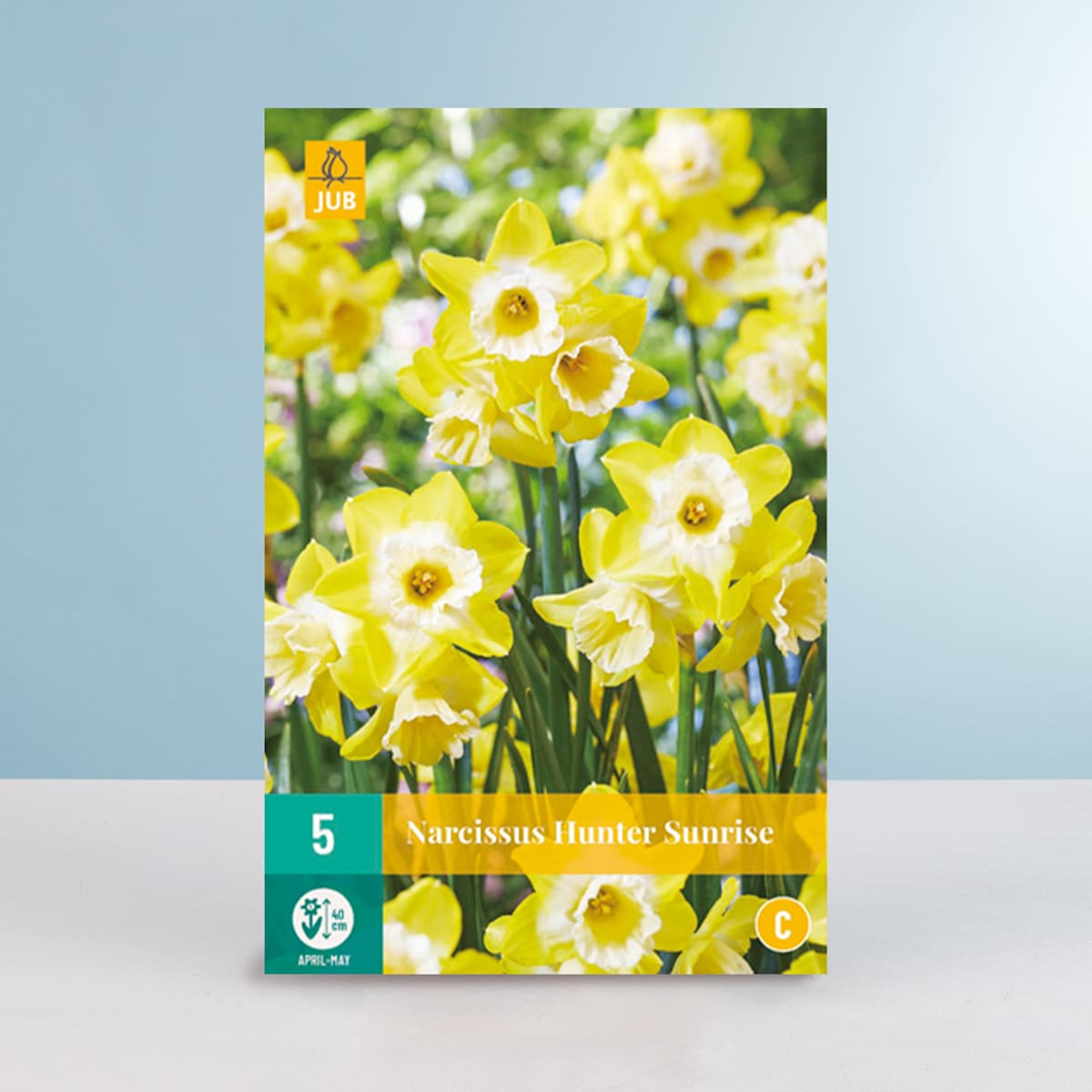 Weiße Blüte und gelbe Krone ist unter Narzissen eine beliebte Kombination. Die Narzisse ‚Hunter Sunrise‘ macht es einfach mal andersherum. Ab April trägt sie auf ihren bis zu 40 cm hohen Stängeln hellgelbe Blüten mit einer schönen weißen Krone. Übrigens nicht nur eine, sondern gleich mehrere. Es ist dieser Vertreterin der Art Narcissus Hybrid egal, ob du die 5 Zwiebeln, die du erhältst, jetzt ins Beet, in deinen Blumenkübel oder den Balkonkasten pflanzt. Solange sie einen windgeschützten, sonnigen Standort bekommt, ist sie zufrieden.