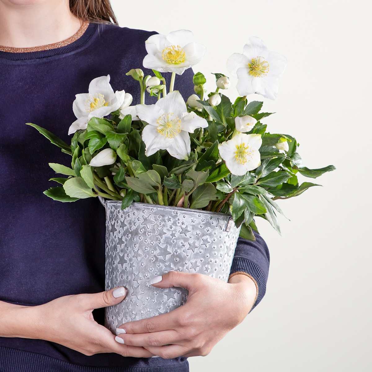 Du möchtest deinen Lieblingsmenschen in der Weihnachtszeit mit einer pflegeleichten und zugleich frostfesten Pflanze überraschen, die auch im Winter blüht? Dann ist die traumhafte Christrose Naturzauber mit dekorativem Zink-Übertopf genau das Richtige. Die beeindruckende Schönheit erreicht eine Wuchshöhe von ca. 60 cm. Sie liebt einen gleichmäßig feuchten Wurzelbereich und fühlt sich an einem Outdoor-Standort besonders wohl. Weder Schnee noch Frost können der Christrose etwas anhaben. Ihre üppige Blütenpracht in Weiß sitzt auf kräftigen Stängeln und bildet einen schönen Kontrast zum dunklen Blattgrün. Fühlt die Pflanze sich wohl, bleiben die Blüten über viele Wochen erhalten. Später kann die Winterrose direkt in die Erde gepflanzt werden.