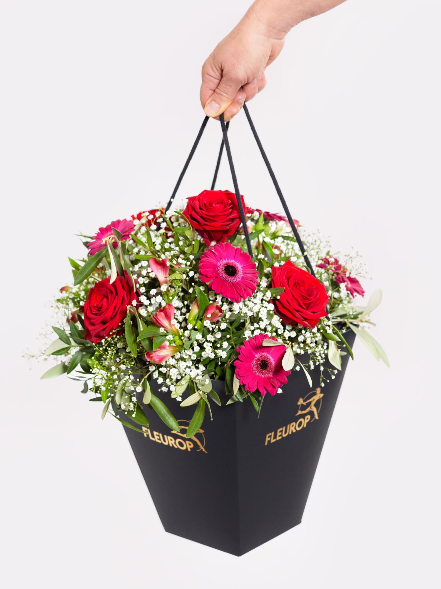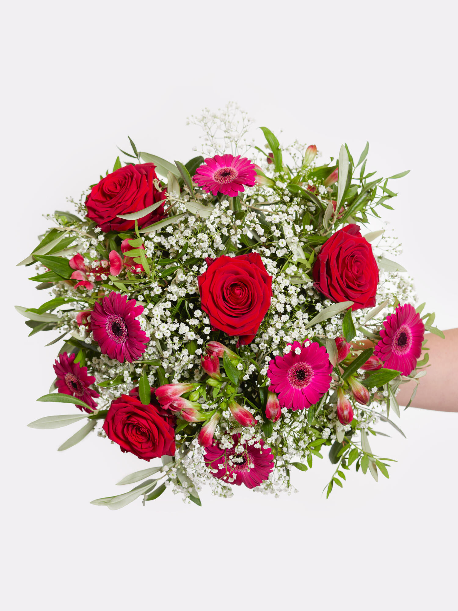 Rund gebundener Strauß in Rot-Violett-Pink mit Rosen, Germini, Schleierkraut und Inkalilien (Alstromerien). Als Beiwerk werden Olive und Pistazie verwendet.