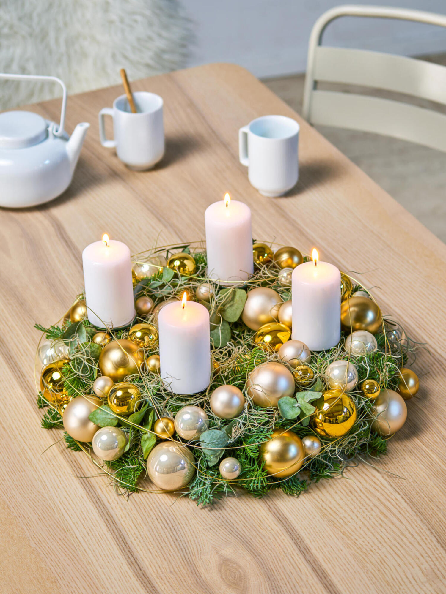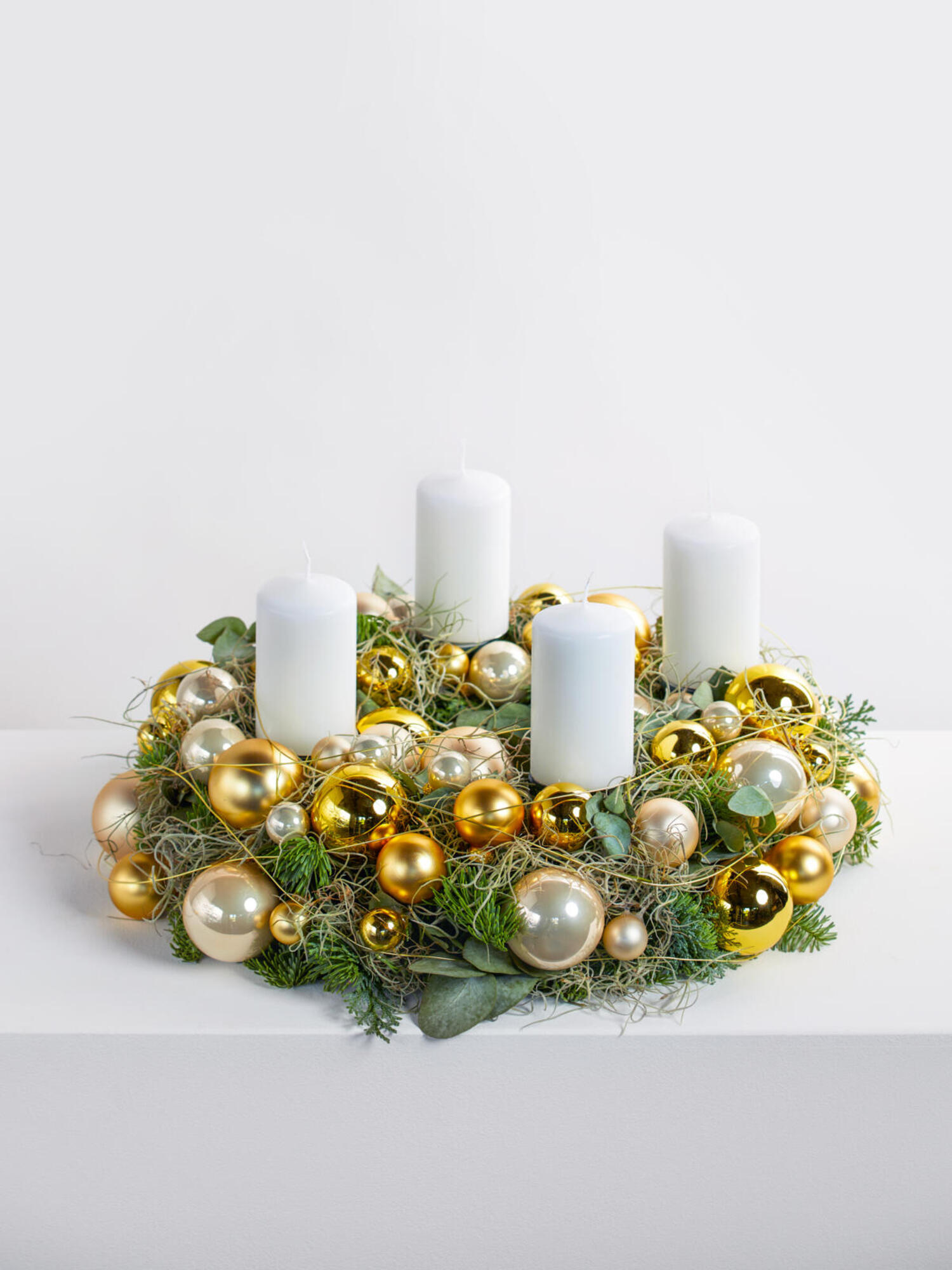 Runder Adventskranz aus Konifere mit vier weißen Stumpenkerzen, goldenen und cremefarbenen Weihnachtskugeln aus Glas, Golddraht, Eukalyptus und Tillandsia. Außendurchmesser ca. 40 cm