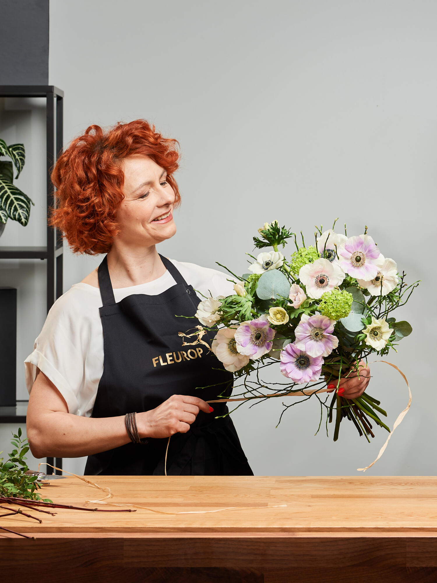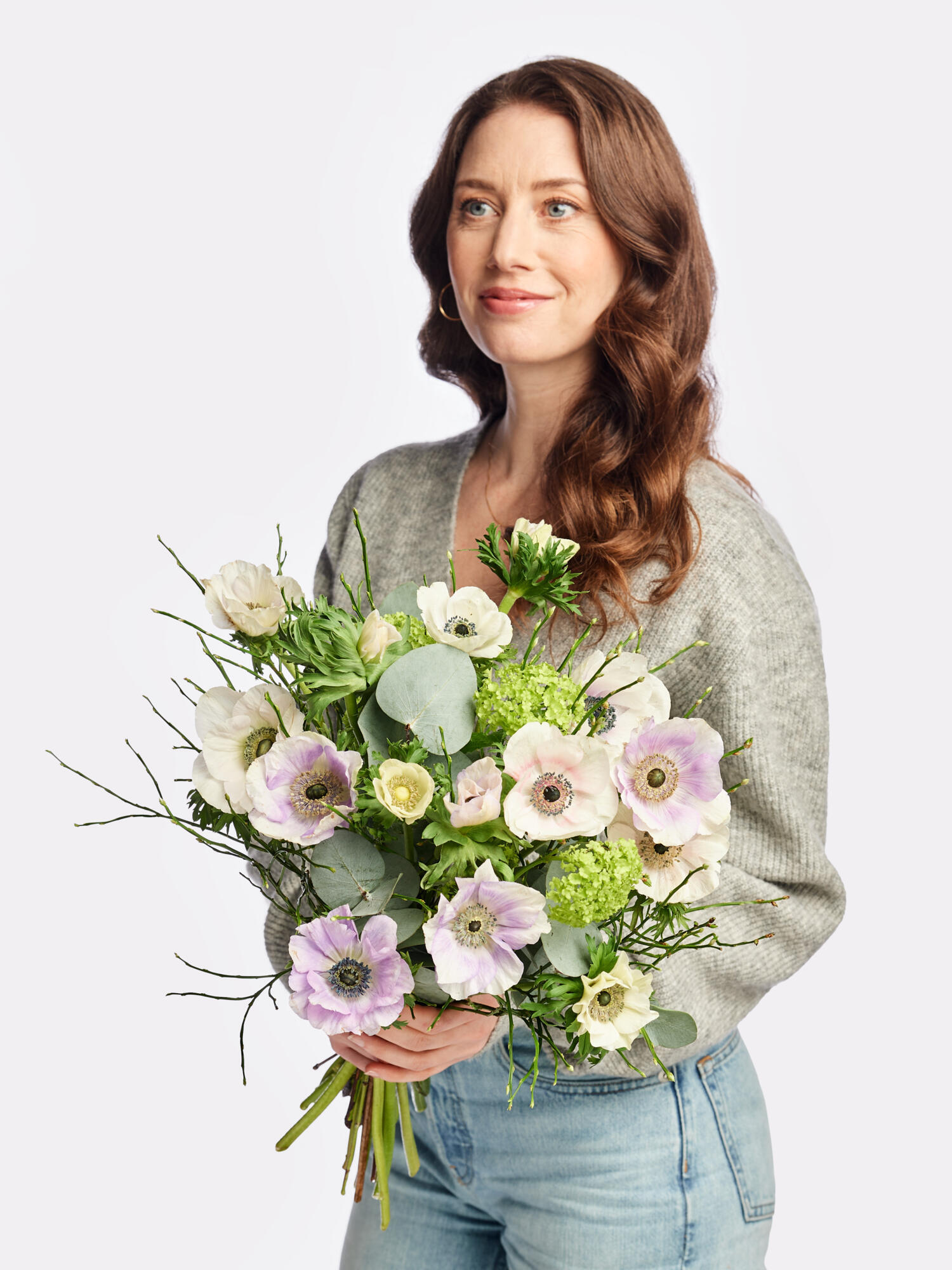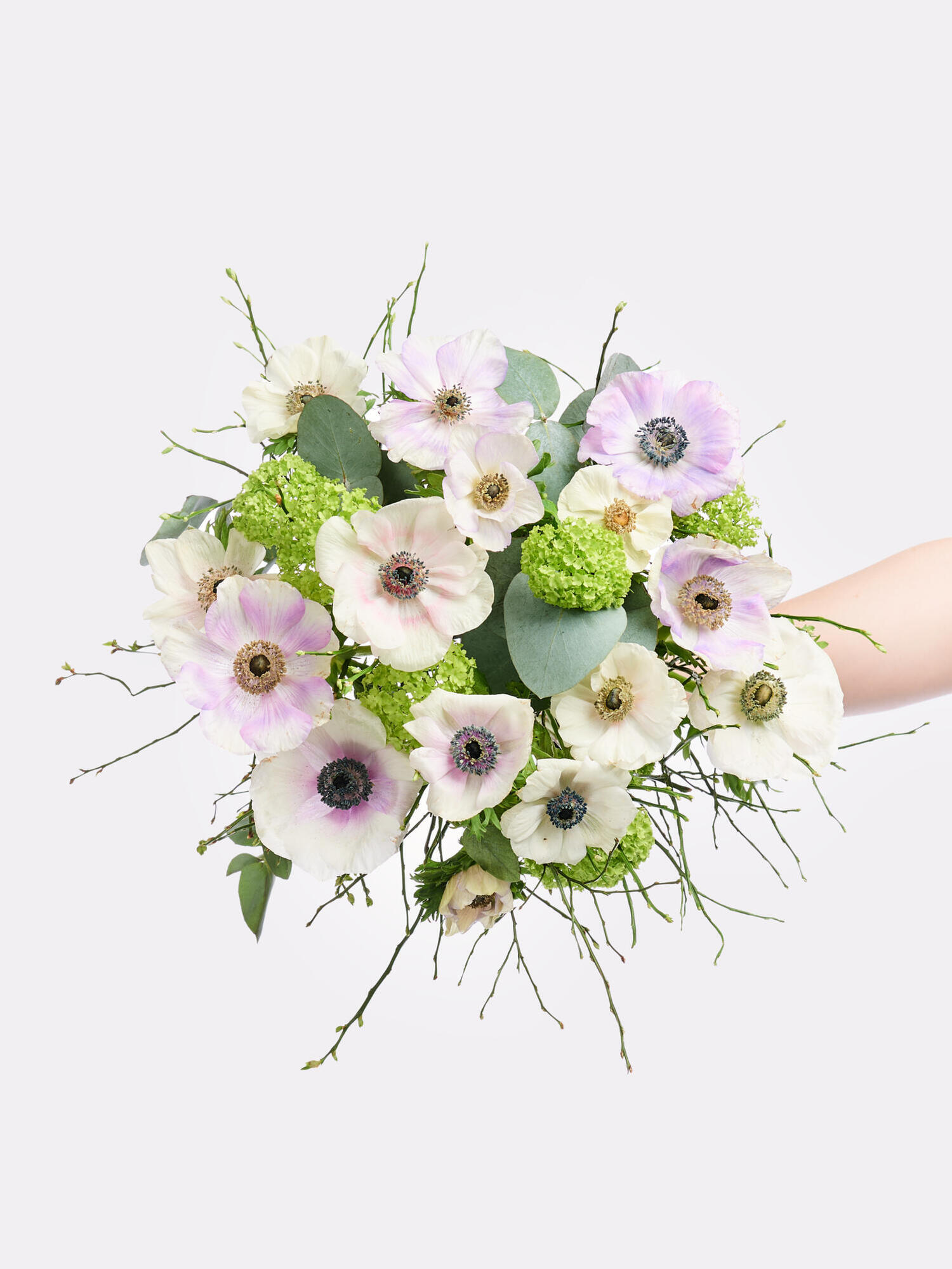 Rund gebundener Strauß aus pudrigen Anemonen in Zartlila-Rosé und grünem Schneeball. Als Beiwerk werden Eukalyptus und Heidelbeere eingesetzt.