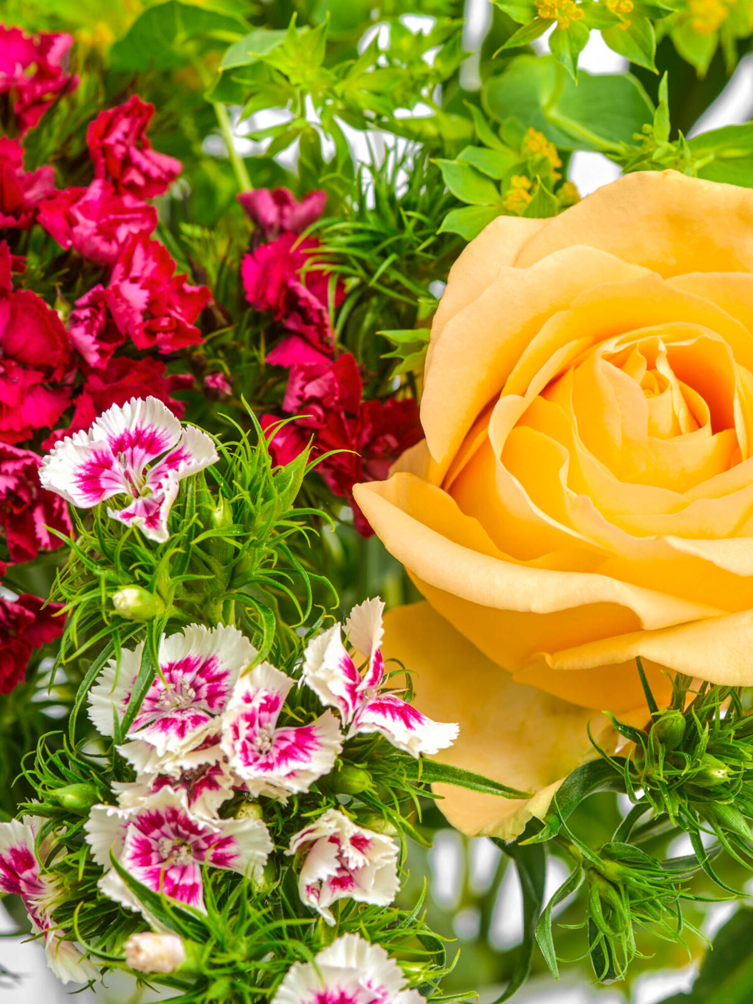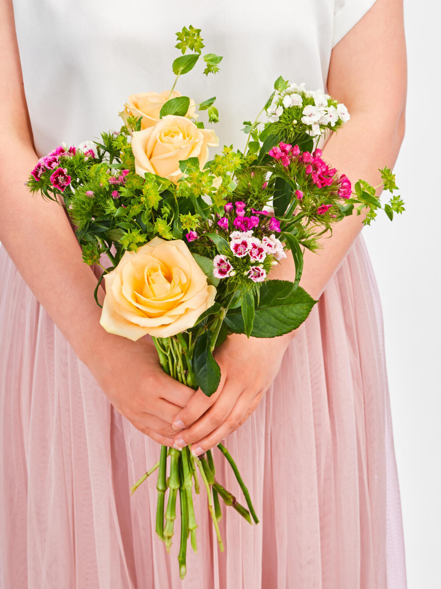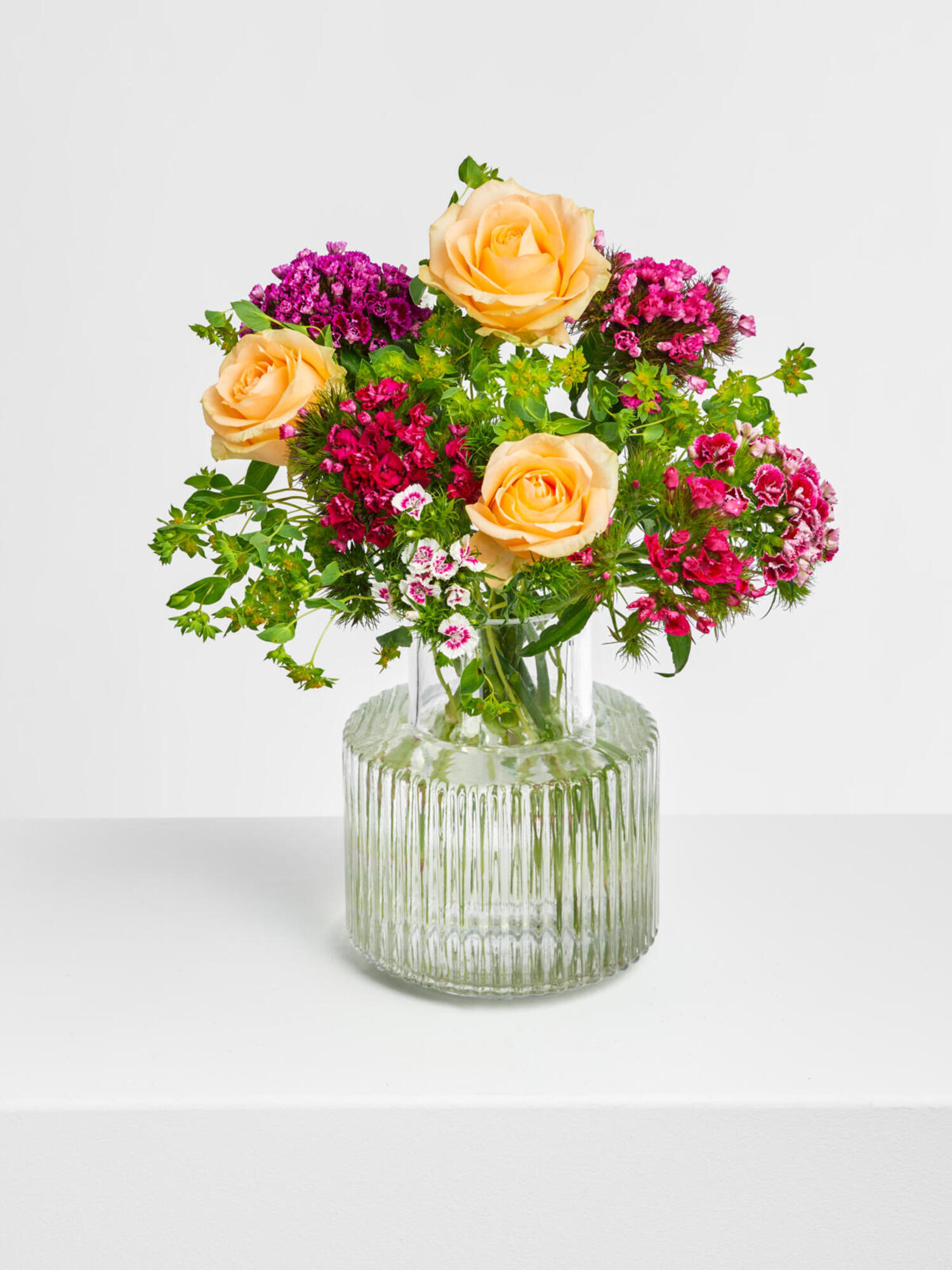 Bestellen Sie online einen sommerlichen Blumengruß. Dieses Arrangement besticht durch großköpfige Rosen in Apricot. ➤ Jetzt online verschicken!