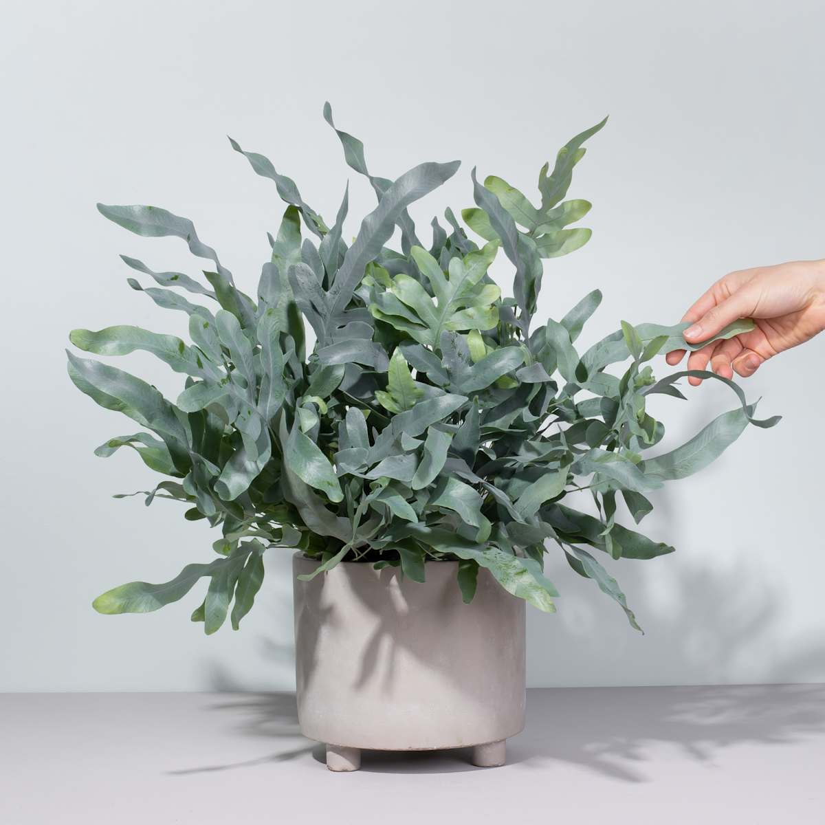 Phlebodium ‚Blue Star‘ – welch ein Name, und: Welch eine Pflanze! Dieser Blaufarn sieht nicht nur richtig abgefahren aus, er ist außerdem in der Lage, die Luft von Schadstoffen und sogar von Giften wie Benzol zu reinigen. Ganz nebenbei beeindruckt er noch mit seiner blaugrünen Färbung und zieht definitiv die Blicke deiner Gäste auf sich. Stell dir Phlebodium ‚Blue Star‘ ins Büro und du kannst dich über gesunde Luft und einen sehr genügsamen Pflanzenfreund freuen. Der Phlebodium ‚Blue Star‘ muss nur regelmäßig gegossen werden. Wenn du darauf achtest, dass die Erde immer leicht feucht ist, macht er fast alles mit. Nur eine Sache kann er nicht leiden: pralle Sonne. Morgen- oder Abendsonne sind für ihn noch in Ordnung, sonst steht er lieber hell.