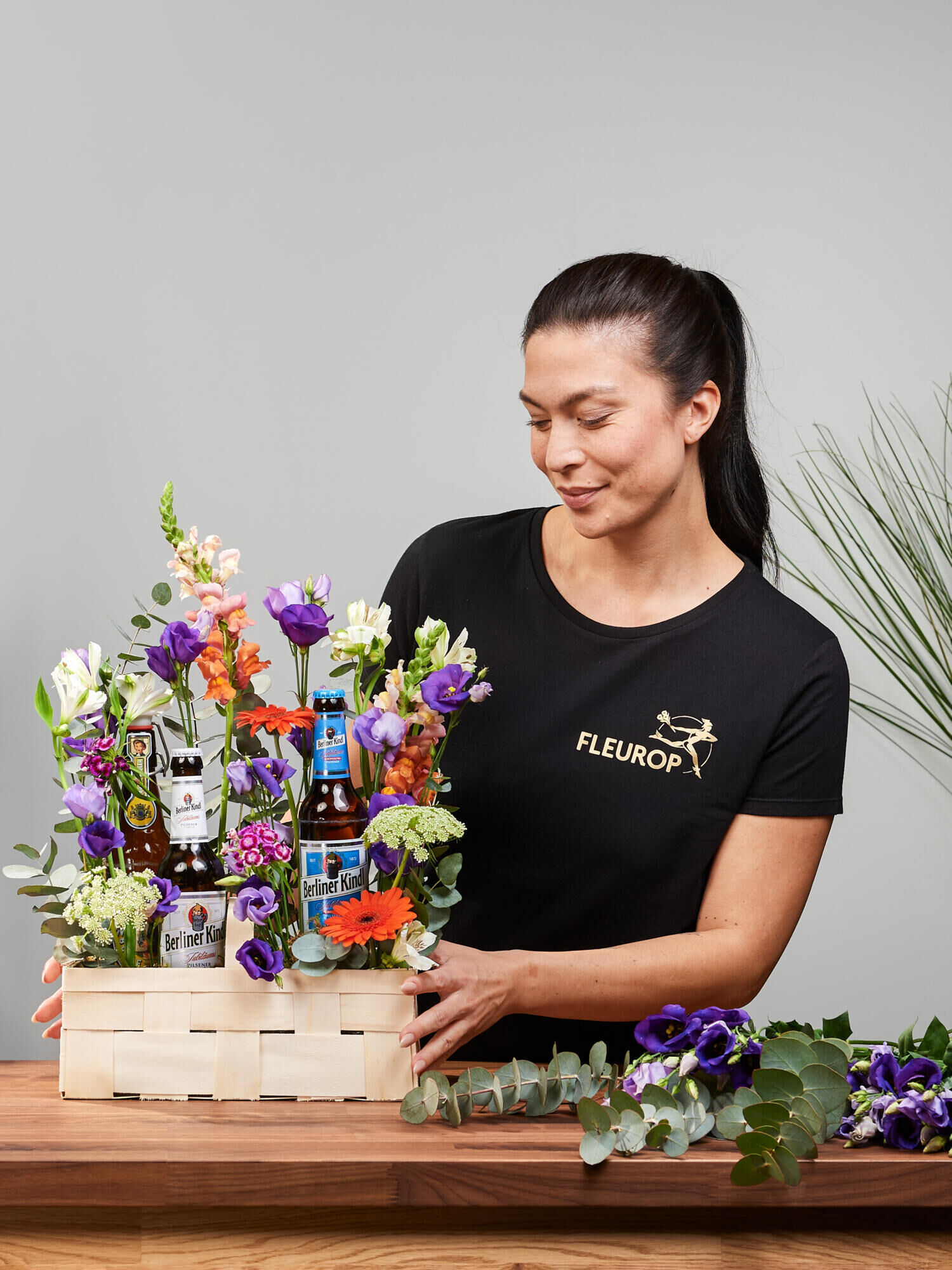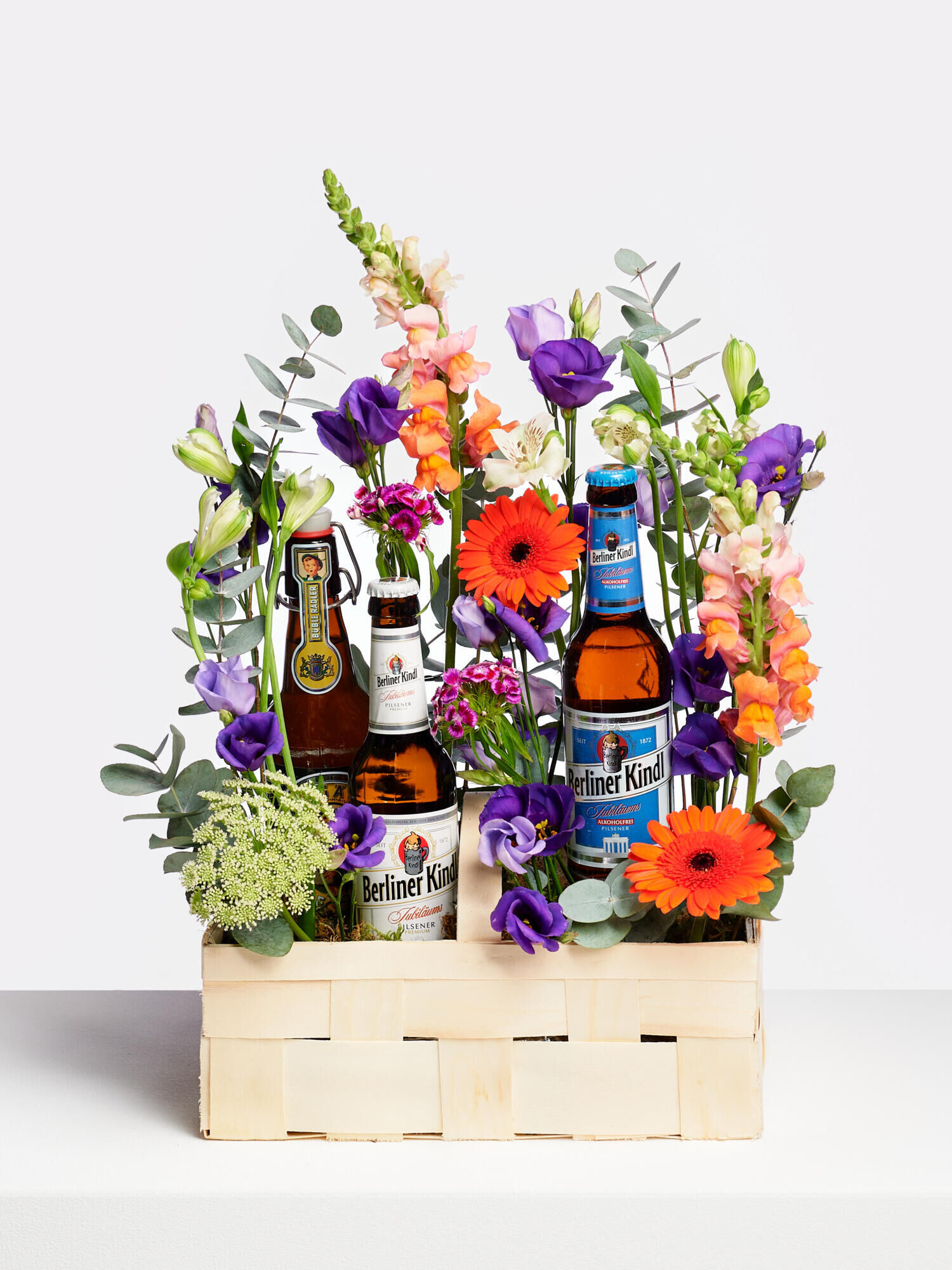 Das bunte Blumengesteck im Korb mit drei Flaschen Bier verschicken mit dem Fleurop Blumenversand. ➤ Jetzt online bestellen und den Sommer verschenken!