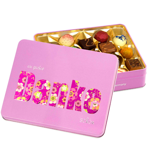 Ein blumiges ?Dankeschön? überreichst Du mit der nostalgischen Präsentdose ?Ein großes Dankeschön? mit aufwendiger 3D-Prägung. Enthalten sind 17 feine verschiedene Pralinen welche von unseren erfahrenen Konditormeistern noch in Handarbeit ausgarniert und handverlesen werden. Somit ist jedes kleine Schokoladenkunstwerk ein echtes Unikat. Schenke ein Lächeln! Gewicht: ca. 210 g. Verpackt in bruchsicherer Kartonage.