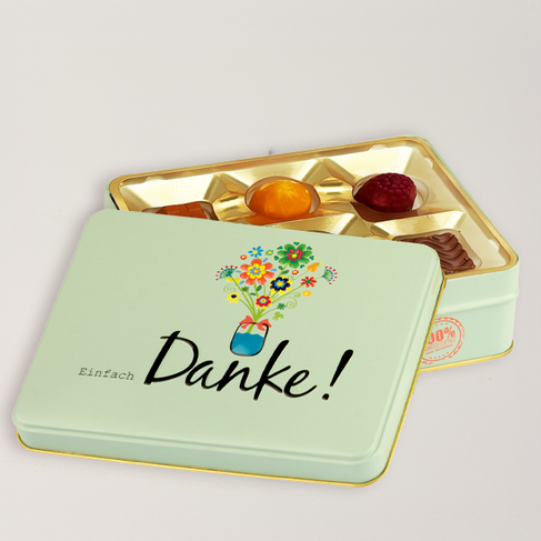 Ein blumiges ?Dankeschön? überreichst Du mit der nostalgischen Präsentdose ?Einfach Danke!? mit aufwendiger 3D-Prägung der Manufaktur Rabbel. Enthalten sind 6 feine verschiedene Pralinen welche von unseren erfahrenen Konditormeistern noch in Handarbeit ausgarniert und handverlesen werden. Somit ist jedes kleine Schokoladenkunstwerk ein echtes Unikat. Schenke ein Lächeln! Gewicht: ca. 75 g. Verpackt in bruchsicherer Kartonage.