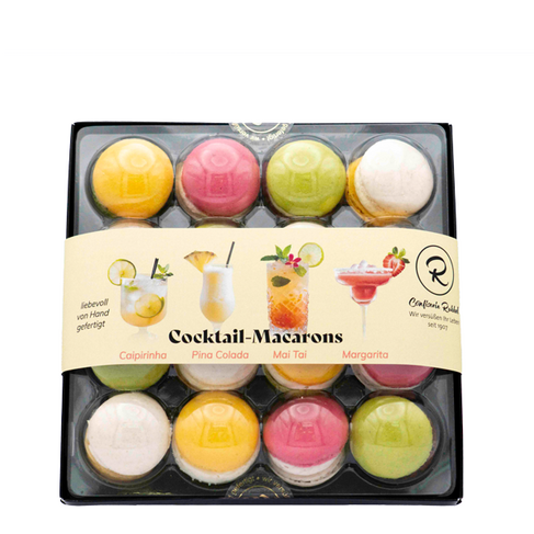 Verschenke französische Eleganz mit leckeren Macarons. Diese Spezialität ist in einer deutschen Confiserie handgefertigt. Überrasche Deine Liebsten mit diesem süßen Genuss und verbreite Freude mit dem Geschmack sommerlicher Cocktails. Gewicht ca. 150 g. Verpackt in bruchsicherer Kartonage. Hinweis: enthält Alkohol