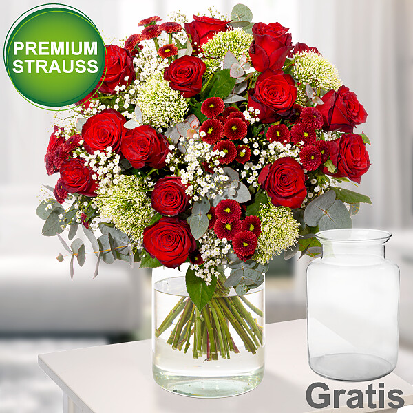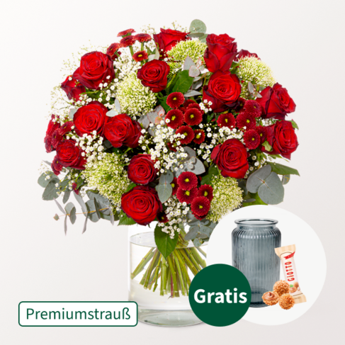 Wundervoller Premiumstrauß mit roten Premiumrosen (70 cm) weißem Schleierkraut weißen Trachelium roten Santiniballs und Eukalyptus. Durchmesser ca. 40 cm. Frisch für Dich zusammengestellt mit Pflegetipps Blumennahrung und Wasser versorgt. Hersteller:FloraPrima GmbHDidderser Str. 2838176 Wendeburginfo@floraprima.de