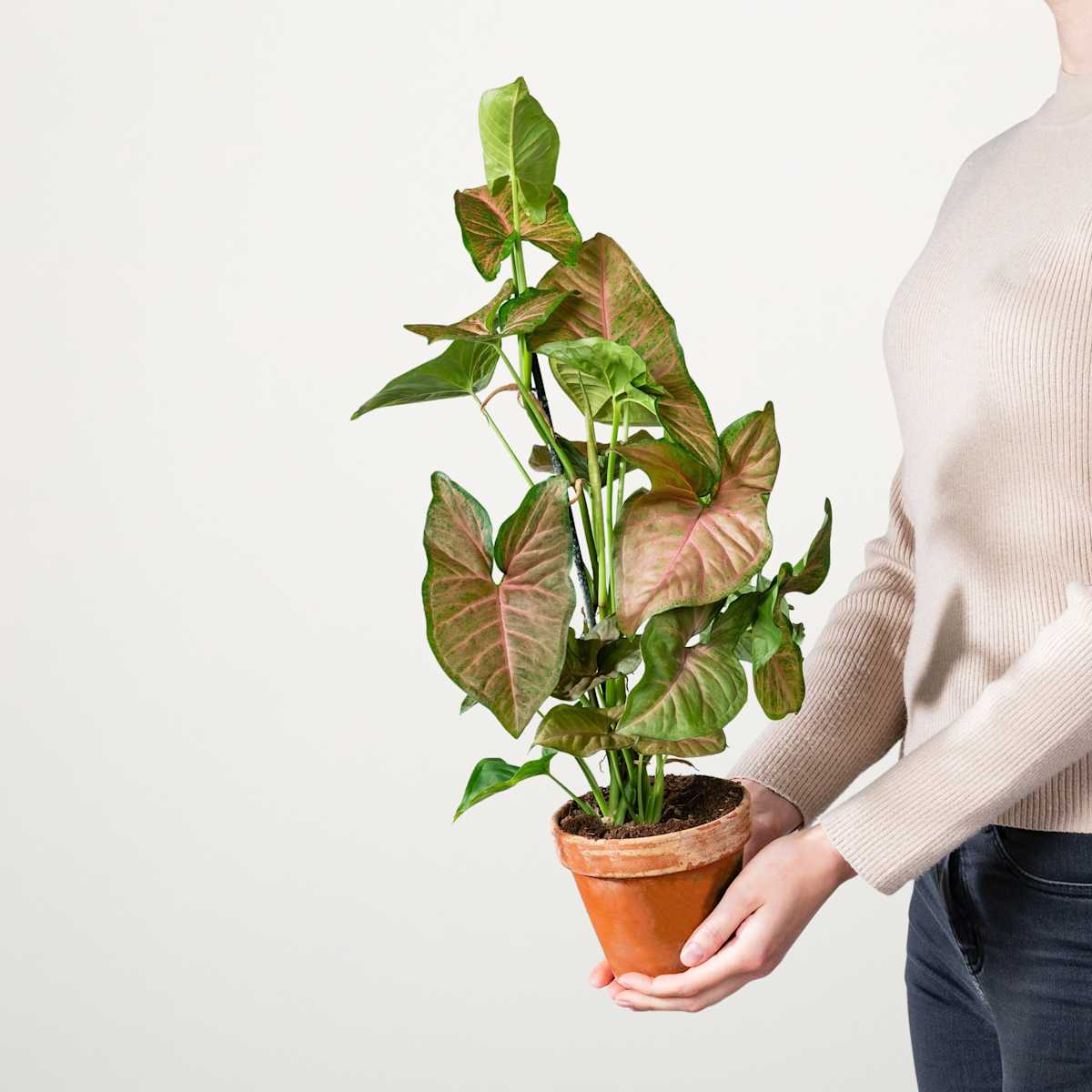 Ganz ohne Grün geht es für die Purpurtute ‚Pink Margarita‘ auch nicht, aber wie ihr Name schon verrät, sie mag auch Pink sehr gerne. Aber für eine Vertreterin der Art Syngonium podophyllum ist das ja kein Problem: Sie färbt den Blattrand einfach grün und die Blattadern pink und alles dazwischen ist dann eine Mischung aus beidem. Ganz nebenbei ist diese rankende, etwa 50 cm hoch und 30 cm breit werdende Zimmerpflanze damit ein Blickfang. Und es ist ihr dabei auch egal, ob du sie in dein Regal, oder auf deinen Schreibtisch stellst.Die Purpurtute ‚Pink Margarita‘ muss regelmäßig gegossen werden. Wenn du darauf achtest, dass die Erde immer leicht feucht ist, belohnt sie dich mit kräftigem Wuchs. Am besten kann sie das an einem sonnigen bis halbschattigen Standort.