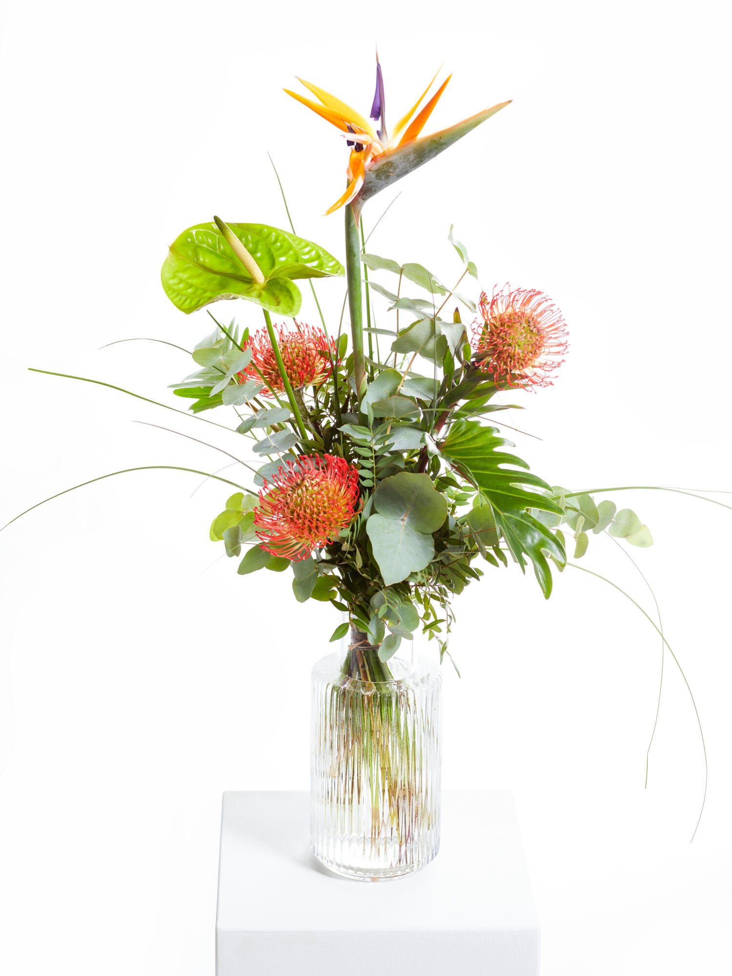 Gestaffelt gebundener Strauß in Grün-Orange-Rot mit Anthurien, Strelitzien und Nadelkissen (Nutans). Als Beiwerk werden Philodendron ‚Xanadu‘, Eukalyptus, Pistazie und Bärgras verwendet.