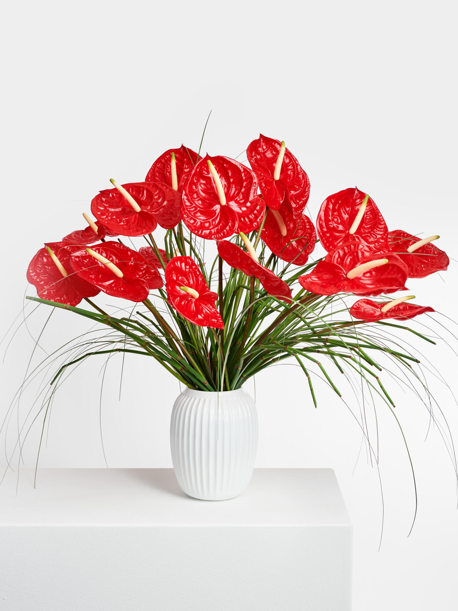 Machen Sie Ihren Liebsten eine ganz besondere Freude und verschenken Sie exotische Blumengrüße. Gestaffelt gebundener Strauß bestehend aus roten Anthurien, Equisetum und Gräsern.