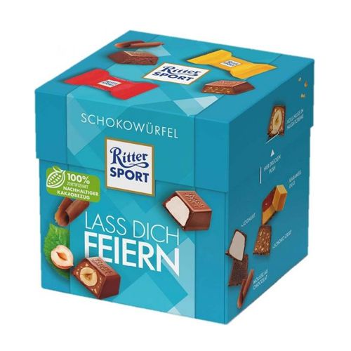 Lass dich feiern – mit einem Schokowürfel Ritter Sport Schokowürfel Lass dich feiern: Schokolade zu besonderen Anlässen. Enthaltene Sorten: Joghurt, Schoko Crisp, à la Mousse au Chocolat, Voll-Nuss in Nugatcreme und KaramellDuo. Dieser Artikel ist nur in Kombination mit einem Blumenstrauß oder einer Zimmerpflanze bestellbar.