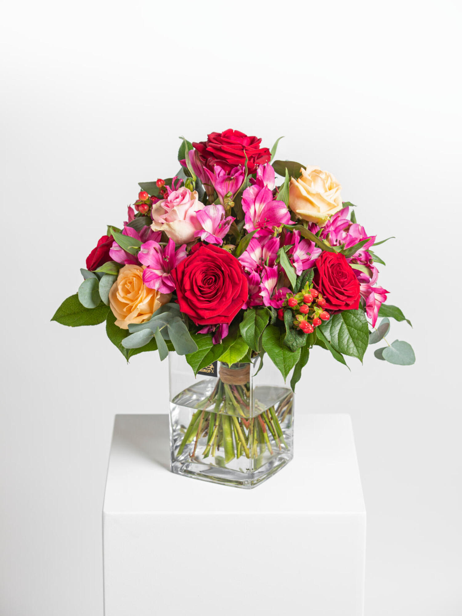 Zeigen Sie dem besonderen Menschen in Ihrem Leben, was er/sie Ihnen bedeutet. Rund gebundener Blumenstrauß in Pink-Rot-Apricot mit Rosen, Hypericum und Alstromerien. Als Beiwerk werden Salal und Eukalyptus verwendet.