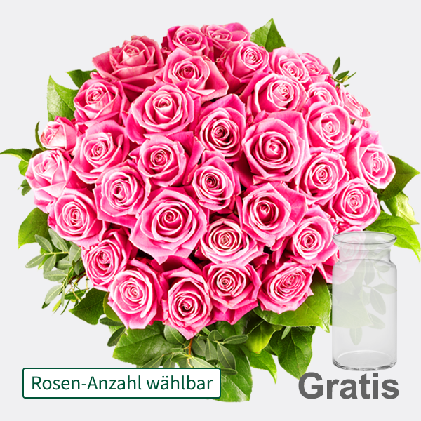 Rosenstrauß floristisch rund gebunden. Mit Lederfarn Chico Pistazie und Ruscus. Die Rosen sind ca. 40-50 cm lang und haben eine Kopfgröße von ca. 35 cm. Mit ausführlicher Pflegeanleitung und 1 Beutel Blumennahrung. Du kannst wählen von 10 bis 100 Rosen!Bis 29 Rosen gibt es eine Gratis-Glasvase dazu. Ab 30 Rosen gibt es eine Gratis-Premiumvase dazu. Ab 71 Rosen wird die Rosenmenge auf 2 Sträuße aufgeteilt und es werden 2 Gratis-Premiumvasen mitgeliefert. Bitte gib bei ?Anzahl? Deine gewünschte Rosenmenge ein (ab 10 Stck). Der Preis wird automatisch angezeigt. Hersteller:FloraPrima GmbHDidderser Str. 2838176 Wendeburginfo@floraprima.de