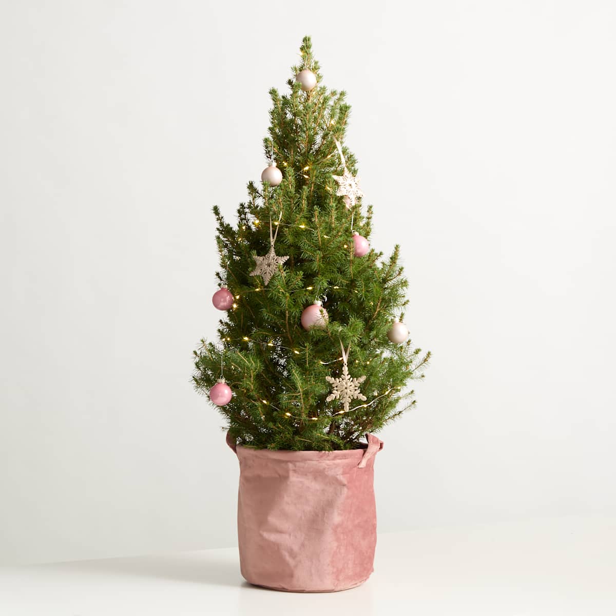 Weihnachtszauber, Tannenduft und eine festliche Dekoration – mit unserem stimmungsvollen Tannenbaum Rosa Zauber erhältst du alles zusammen. Die schöne Fichte mit ca. 75 cm Höhe befindet sich in einem Samtkorb mit ca. 23 cm Durchmesser. Sie wartet nur darauf von Dir geschmückt zu werden und deinem Hauseingang oder deinem Wohnraum ein weihnachtliches Flair zu verleihen. Der Schmuck besteht aus 12 rosa Christbaumkugeln, 6 Schneeflocken aus Metall in Champagner-Glitzer Optik, außerdem noch einer Lichterkette mit 100 energieeffizienten LEDs. Batterien sind nicht im Lieferumfang enthalten. Versorge den Wurzelstock des kleinen Bäumchens regelmäßig mit frischem Wasser und platziere ihn nicht direkt vor der Heizung. Am wohlsten fühlt sich die kleine Fichte an einem kühlen Standort. Eine tolle Weihnachtsdekoration auch zum Verschenken.