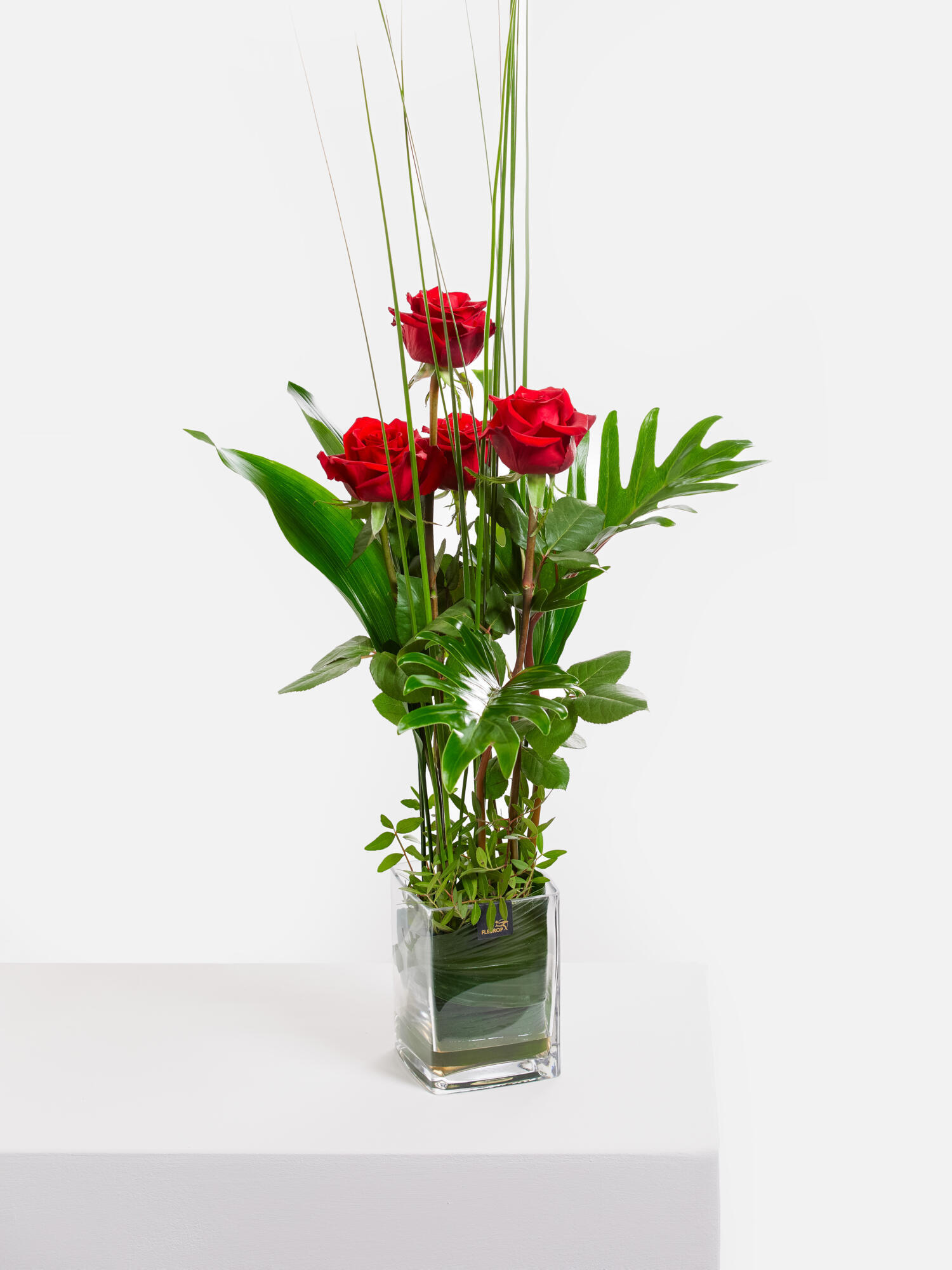 Parallel hoch gestecktes Gesteck in einer Fleurop-Vase mit roten Premium-Rosen, Steelgras, Aspidistra und Philodendronblättern.