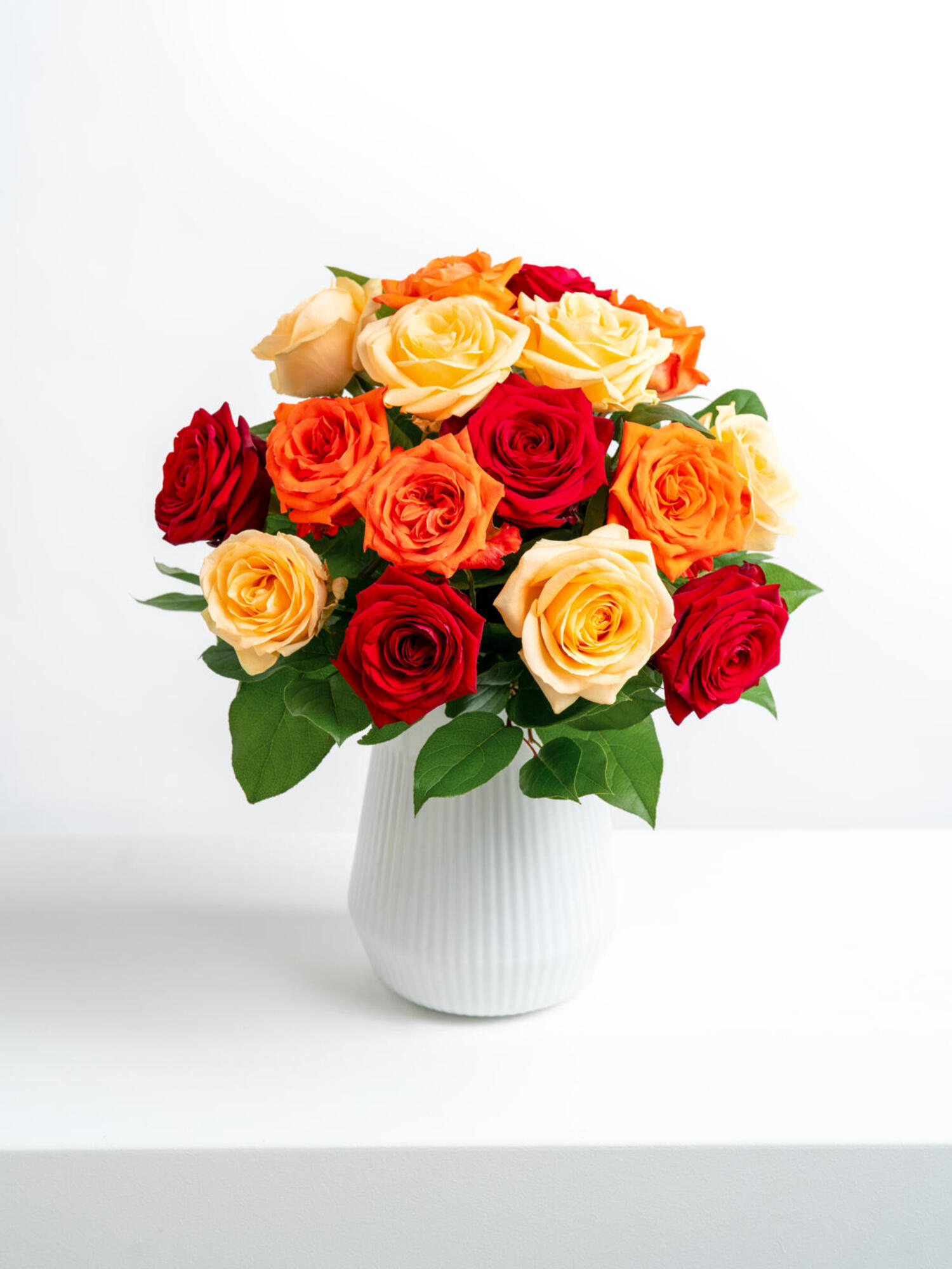 Ein rosiges Farbspiel aus kräftigen und pastellfarbenen Akzenten. Kompakt gebundener Strauß mit großköpfigen, verschiedenfarbigen Rosen in Rot-Orange-Apricot sowie Salal.