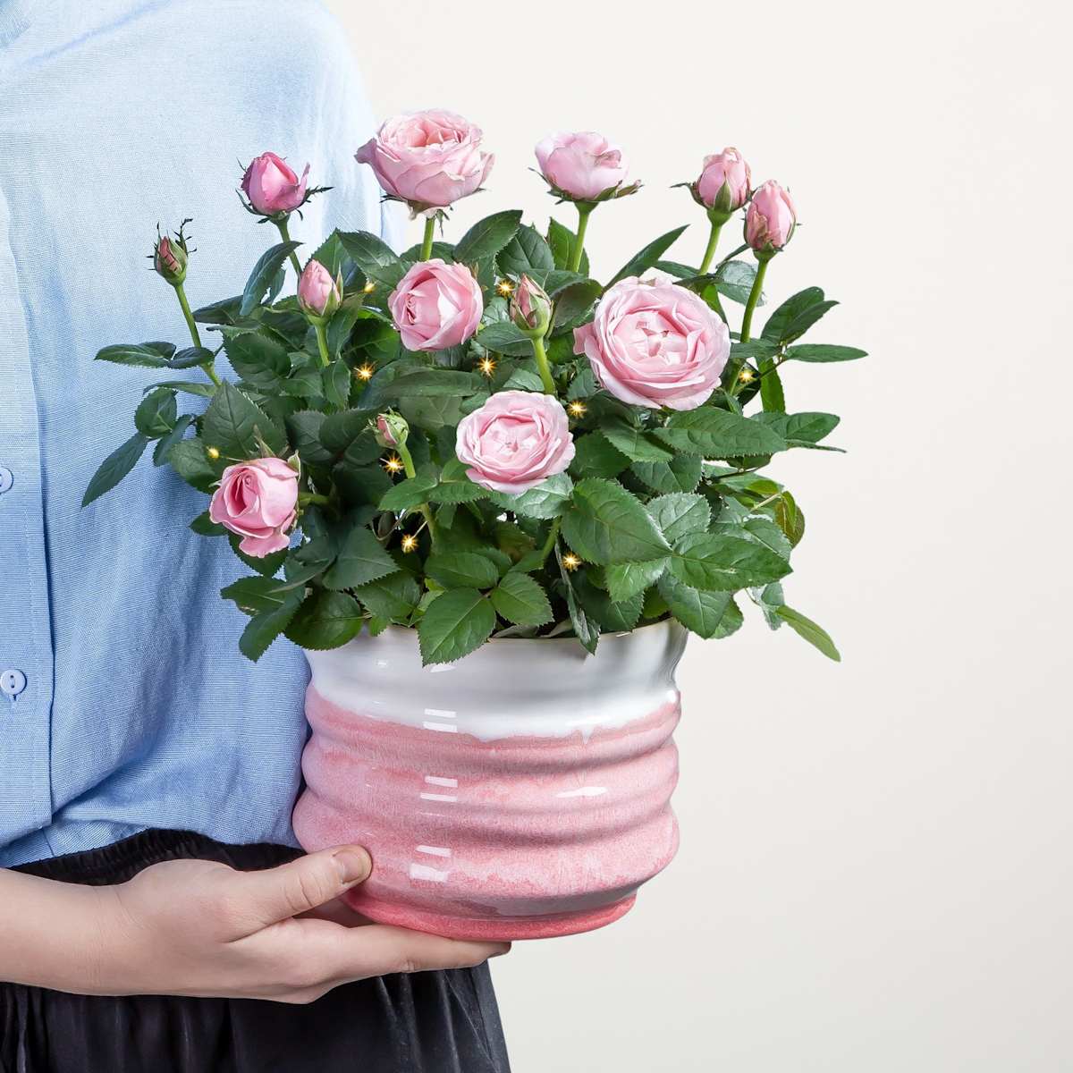 Rosen sind unumstritten die Königinnen unter den Blumen. Sie bestechen mit prall gefüllten Blütenköpfen und einem betörenden Duft. Unsere herrliche Topfrose Rosenliebe mit Lichterkette erreicht dich in teils knospigem Zustand mit einer Wuchshöhe von ca. 30 cm und einer Topfgröße von ca. 14 cm. Die Knospen öffnen sich schon bald zu roséfarbenen Blüten und bilden einen schönen Kontrast zum dunkelgrünen Blattwerk. Ein passender Übertopf in Rosa und Weiß gehört ebenfalls zum Lieferumfang. Rosen lieben einen sonnigen und luftigen Standort, dies trifft auch auf unsere zauberhafte Topfrose zu. Lasse den Wurzelbereich niemals austrocknen, aber vermeide Staunässe. Wusstest du, dass roséfarbene Rosen in der Blumensprache ein Symbol für Schüchternheit und zarte Liebe sind?