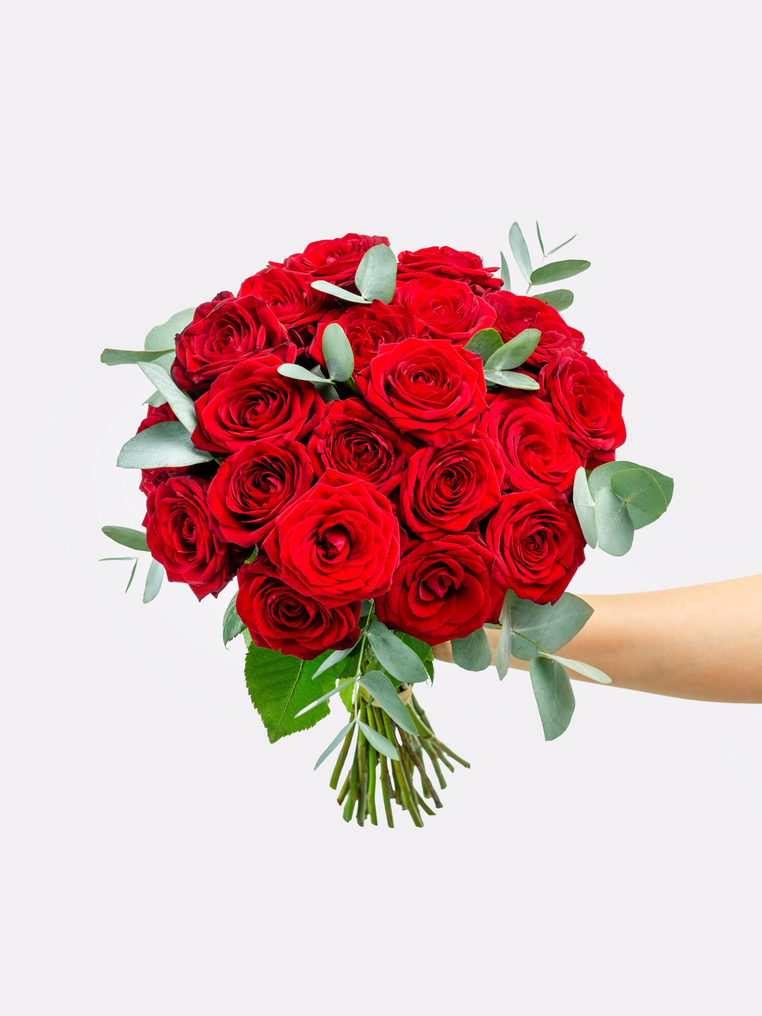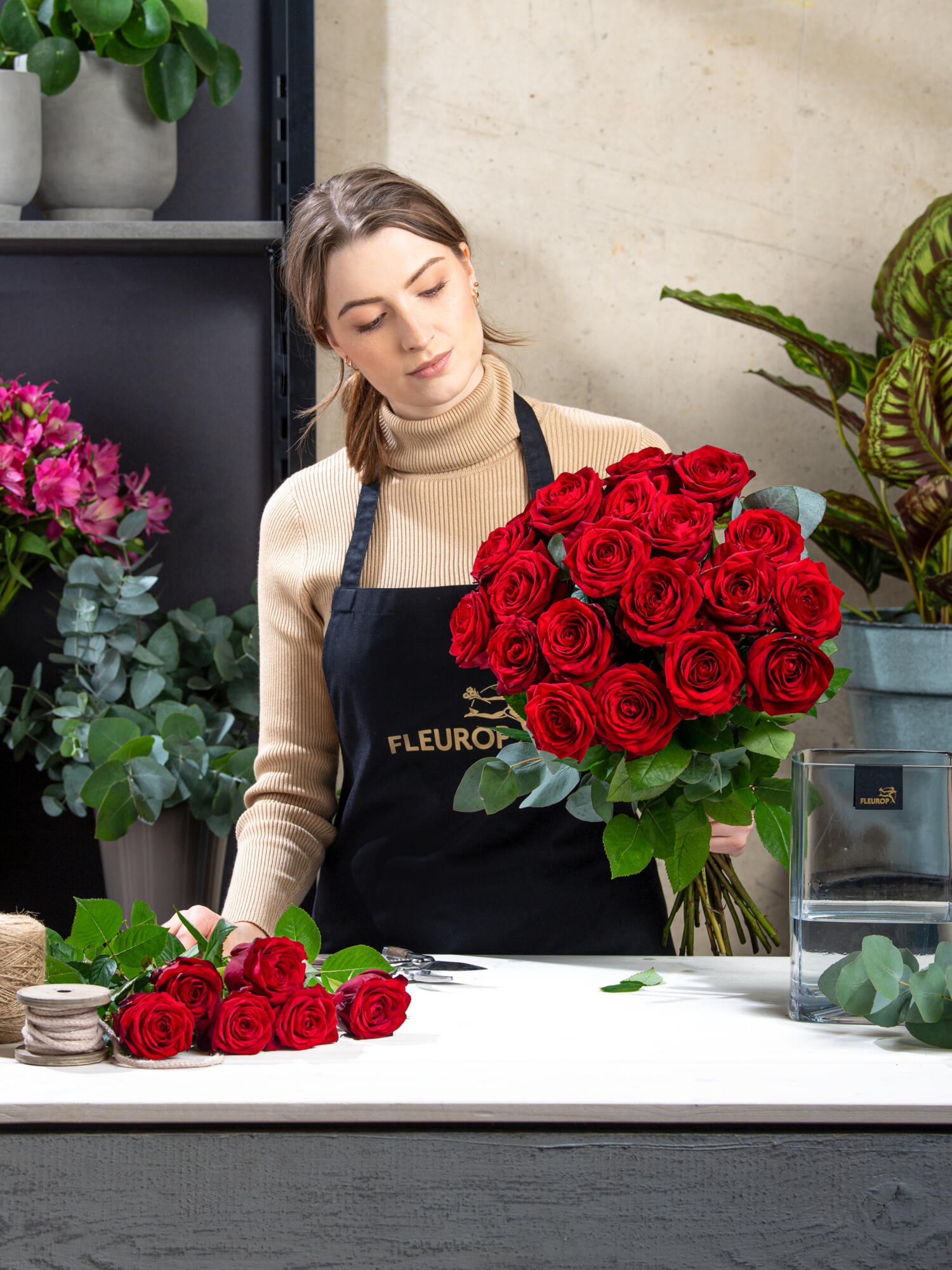 Lieferung innerhalb von 100 Minuten. Bestellbar immer montags bis freitags von 10:00 bis 15:00 Uhr. Es bedarf keiner großen Worte – sondern einfach roter Rosen! Egal zu welchem Anlass. Lang gebundener Strauß aus edlen roten Rosen sowie etwas Eukalyptus als Beiwerk.